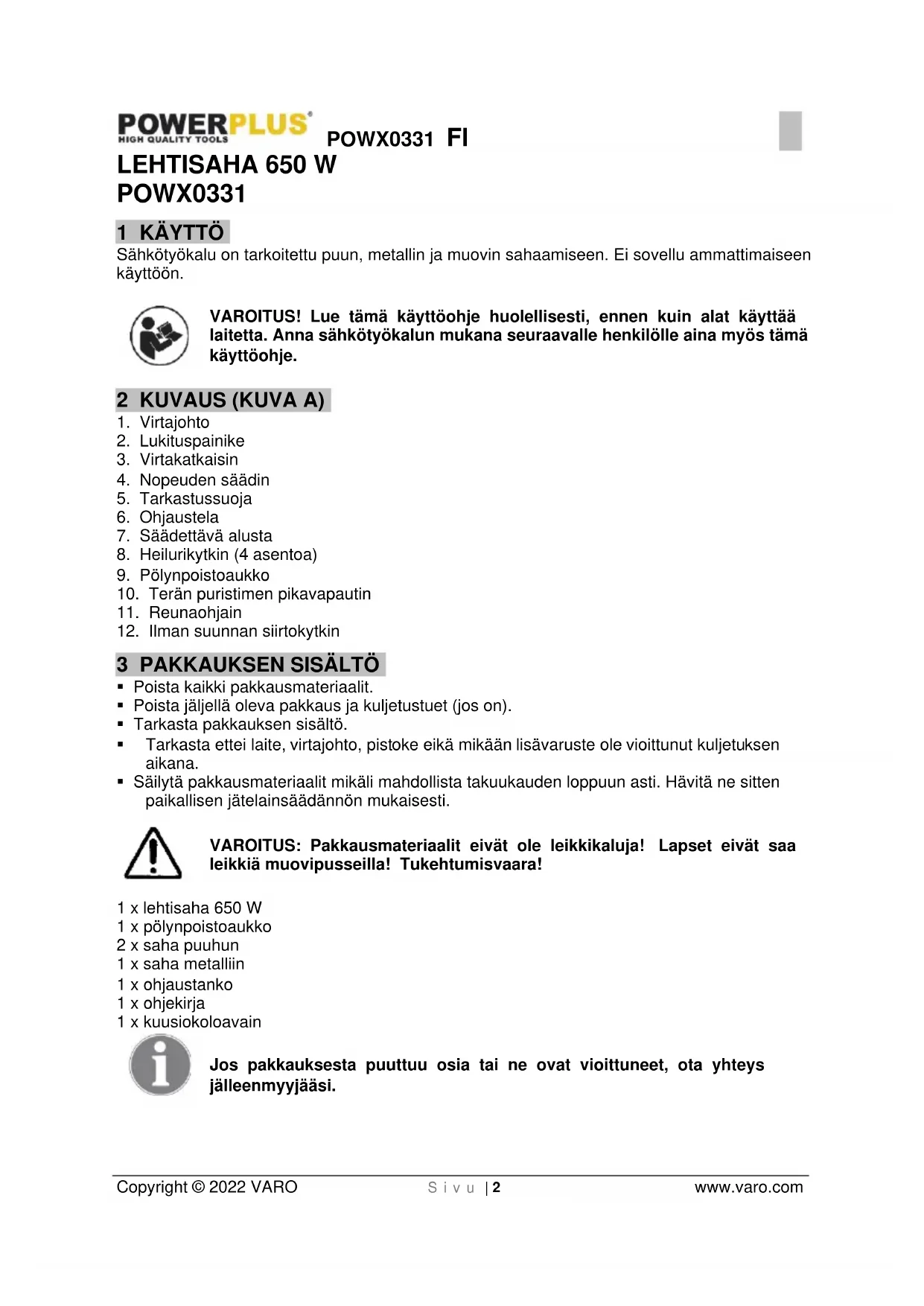 Copyright © 2022 VARO S i v u | 2 www.varo.com LEHTISAHA 650 W POWX0331 1 KÄYTTÖ Sähkötyökalu on tarkoitettu puun, metallin ja muovin sahaamiseen. Ei sovellu ammattimaiseen käyttöön. VAROITUS! Lue tämä käyttöohje huolellisesti, ennen kuin alat käyttää laitetta. Anna sähkötyökalun mukana seuraavalle henkilölle aina myös tämä käyttöohje. 2 KUVAUS (KUVA A)