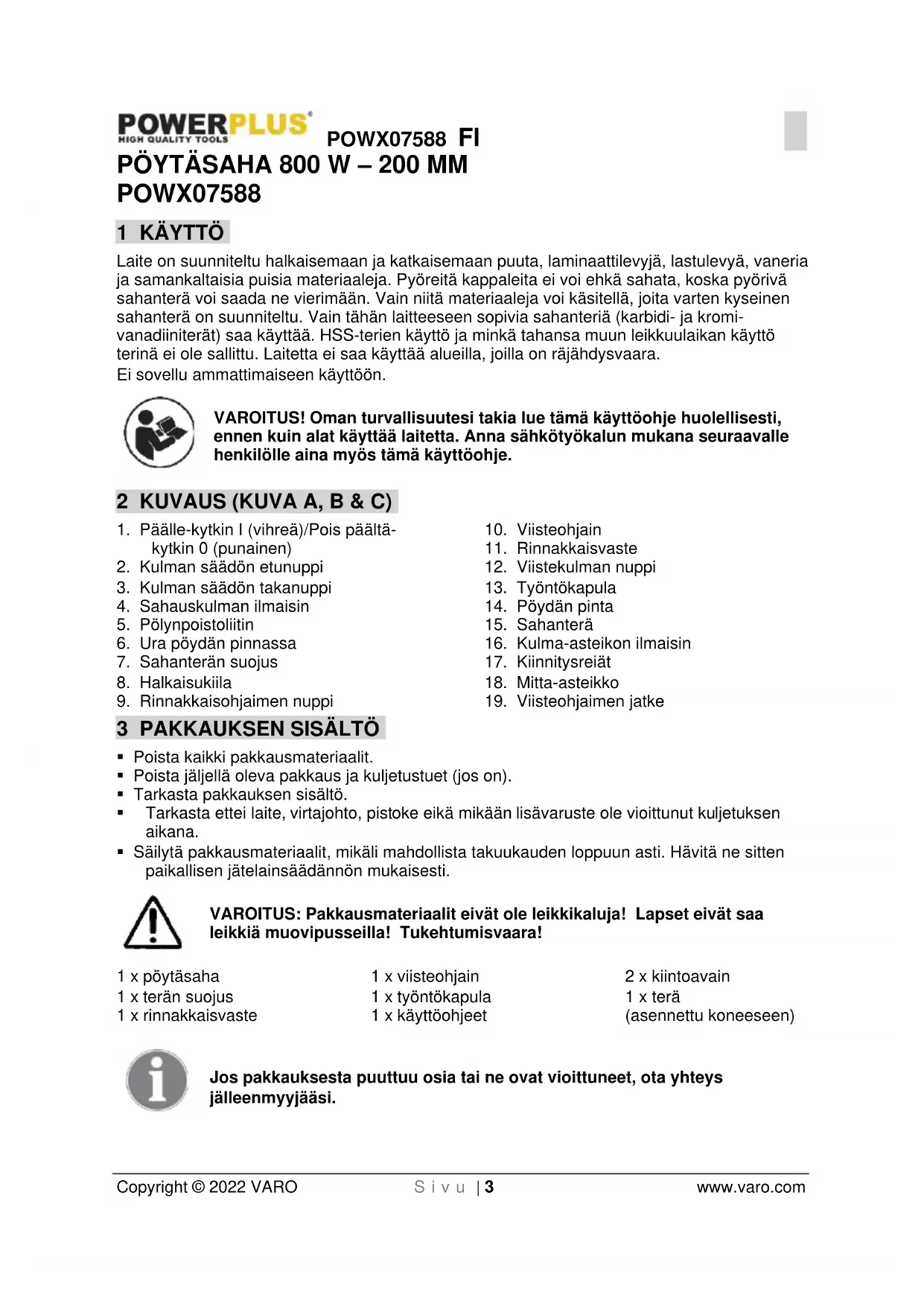 työnnetty kokonaan sahan läpi.POWX07588 FI Copyright © 2022 VARO S i v u | 7 www.varo.com