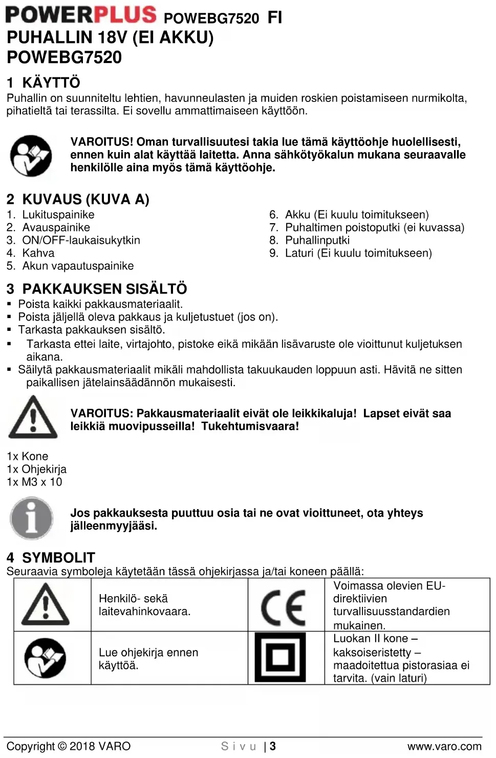 - Jos joudut poistamaan laitteen käytöstä pitkäaikaisen käytön jälkeen, älä hävitä sitä tavallisen kotitalousjätteen mukana, vaan huolehdi sen hävittämisestä ympäristöä suojaavalla tavalla. Sähkölaitteista jäävää romua ei saa hävittää tavallisen kotitalousjätteen tapaan. Vie se kierrätettäväksi mikäli mahdollista. Kysy neuvoa kierrätyksestä paikallisilta viranomaisilta tai jälleenmyyjältä.POWEBG7520 FI Copyright © 2018 VARO S i v u | 10 www.varo.com 17 YHDENMUKAISUUSILMOITUS VARO N.V. - Joseph Van Instraat 9 - BE2500 Lier - BELGIA ilmoittaa, että Tuote: Puhallin 18V Tavaramerkki: POWERplus Malli: POWEBG7520 on yhdenmukaistettuihin eurooppalaisiin standardien soveltamiseen perustuvien sovellettavien eurooppalaisten direktiivien olennaisten vaatimusten ja muiden asiaankuuluvien säännösten mukainen. Laitteen luvaton muokkaaminen johtaa tämän vakuutuksen mitätöitymiseen. Euroopan yhteisön direktiivit (sekä niiden mahdolliset muutokset allekirjoituspäivään saakka): 2011/65/EU 2006/42/EC 2014/30/EU 2000/14/EC Annex V LwA 91dB(A) / 95dB(A) Eurooppalaiset yhdenmukaistetut standardit (sekä niiden mahdolliset muutokset allekirjoituspäivään saakka): EN60335-1: 2012 EN50636-2-100: 2014 EN62233: 2008 EN55014-1: 2006 EN55014-2: 2015 Teknisten asiakirjojen haltija: Philippe Vankerkhove, VARO – Vic Van Rompuy N.V. Allekirjoittanut toimii yrityksen toimitusjohtajan puolesta, Eric de Boer Sääntelyasiat – vaatimuksenmukaisuudesta vastaava johtaja 24/10/2017POWEBG7520 EL Copyright © 2018 VARO Σ ε λ ί δ α | 1 www.varo.com 1 ΕΦΑΡΜΟΓΗ p. 3
