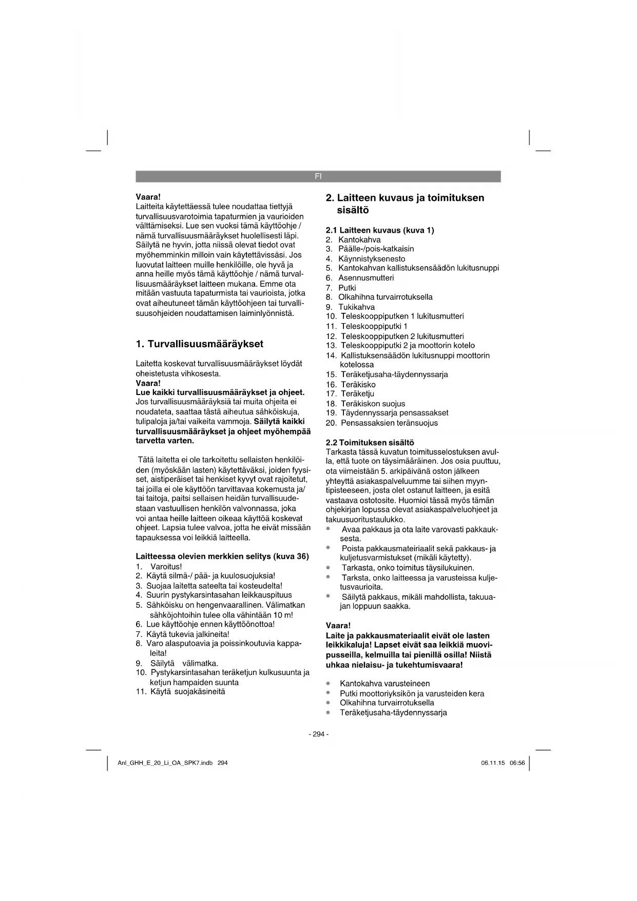 Koskee ainoastaan EU-maita Älä heitä sähkötyökaluja kotitalousjätteisiin! Euroopan direktiivin 2012/19/EY loppuunkäytetyistä sähkö- ja elektronisista laitteista ja sen kansallisek- si laiksi muuntamisen mukaan tulee käytetyt sähkötyökalut koota erikseen ja toimittaa ne ympäristöystä- välliseen kierrätykseen. Kierrätysvaihtoehto takaisinlähetykselle: Sähkölaitteen omistaja on velvoitettu laitteen palauttamisen vaihtoehtona vaikuttamaan siihen, että hänen luovuttamansa omaisuus hävitetään asianmukaisesti. Loppuun käytetty laite voidaan tätä varten luovuttaa myös keräyspisteeseen, joka suorittaa sen käytöstäpoiston kansallisten kierrätystalous- ja jätehuoltolakien tarkoittamalla tavalla. Tämä ei koske käytettyihin laitteisiin liitettyjä lisävarusteita ja apu- välineitä, joissa ei ole sähköosia. Tuotedokumentaation ja tuotteen mukana toimitettujen papereiden osittainenkin kopiointi tai muu monis- taminen on sallittu ainoastaan iSC GmbH:n nimenomaisella luvalla. Oikeus teknisiin muutoksiin pidätetään Anl_GHH_E_20_Li_OA_SPK7.indb 304Anl_GHH_E_20_Li_OA_SPK7.indb 304 06.11.15 06:5606.11.15 06:56FI