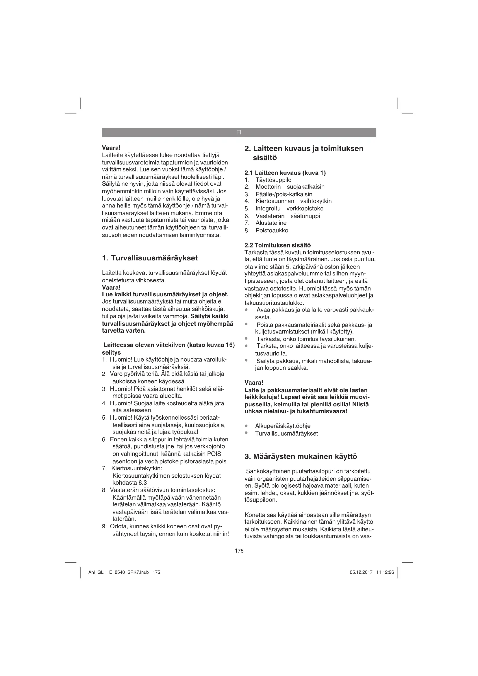 Sähkökäyttöinen puutarhasilppuri on tarkoitettu vain orgaanisten puutarhajätteiden silppuamise- en. Syötä biologisesti hajoava materiaali, kuten esim. lehdet, oksat, kukkien jäännökset jne. syöt- tösuppiloon. Konetta saa käyttää ainoastaan sille määrättyyn tarkoitukseen. Kaikkinainen tämän ylittävä käyttö ei ole määräysten mukaista. Kaikista tästä aiheu- tuvista vahingoista tai loukkaantumisista on vas- Anl_GLH_E_2540_SPK7.indb 175Anl_GLH_E_2540_SPK7.indb 175 05.12.2017 11:12:2605.12.2017 11:12:26FI