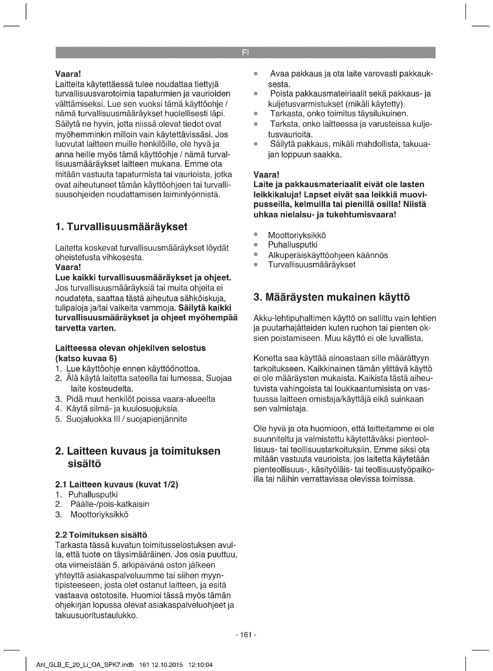Akku-lehtipuhaltimen käyttö on sallittu vain lehtien ja puutarhajätteiden kuten ruohon tai pienten ok- sien poistamiseen. Muu käyttö ei ole luvallista. Konetta saa käyttää ainoastaan sille määrättyyn tarkoitukseen. Kaikkinainen tämän ylittävä käyttö ei ole määräysten mukaista. Kaikista tästä aiheu- tuvista vahingoista tai loukkaantumisista on vas- tuussa laitteen omistaja/käyttäjä eikä suinkaan sen valmistaja. Ole hyvä ja ota huomioon, että laitteitamme ei ole suunniteltu ja valmistettu käytettäväksi pienteol- lisuus- tai teollisuustarkoituksiin. Emme siksi ota mitään vastuuta vaurioista, jos laitetta käytetään pienteollisuus-, käsityöläis- tai teollisuustyöpaiko- illa tai näihin verrattavissa olevissa toimissa. Anl_GLB_E_20_Li_OA_SPK7.indb 161 12.10.2015 12:10:04FI
