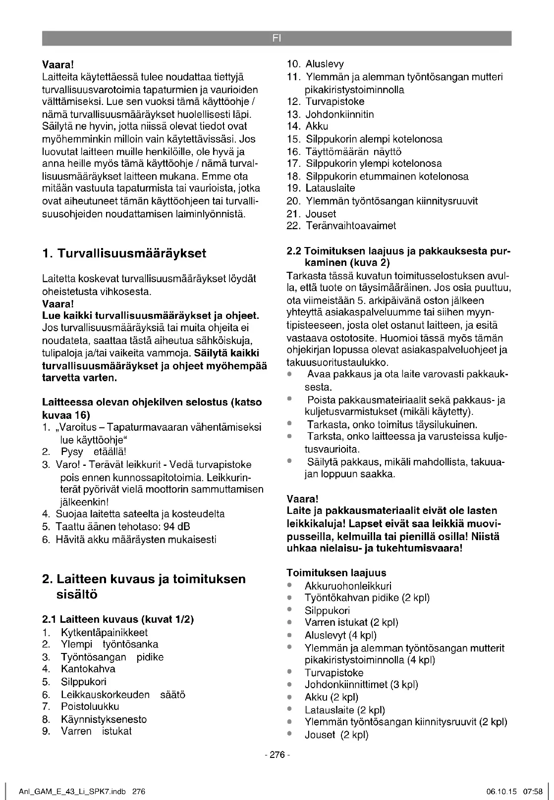 Laite on pakattu kuljetuspakkaukseen, jotta välte- tään kuljetusvauriot. Tämä pakkaus on raaka-ai- netta ja sitä voi siksi käyttää uudelleen tai sen voi toimittaa kierrätyksen kautta takaisin raaka-aine- kiertoon. Laite ja sen varusteet on valmistettu eri materiaaleista, kuten esim. metallista ja muoveis- ta. Vialliset laitteet eivät kuulu kotitalousjätteisiin. Laite tulee toimittaa asianmukaiseen keräyspis- teeseen ammattitaitoista hävittämistä varten. Jos et tiedä, missä on tällainen keräyspiste, tiedustele asiaa kuntasi hallinnosta. Anl_GAM_E_43_Li_SPK7.indb 281Anl_GAM_E_43_Li_SPK7.indb 281 06.10.15 07:5806.10.15 07:58FI