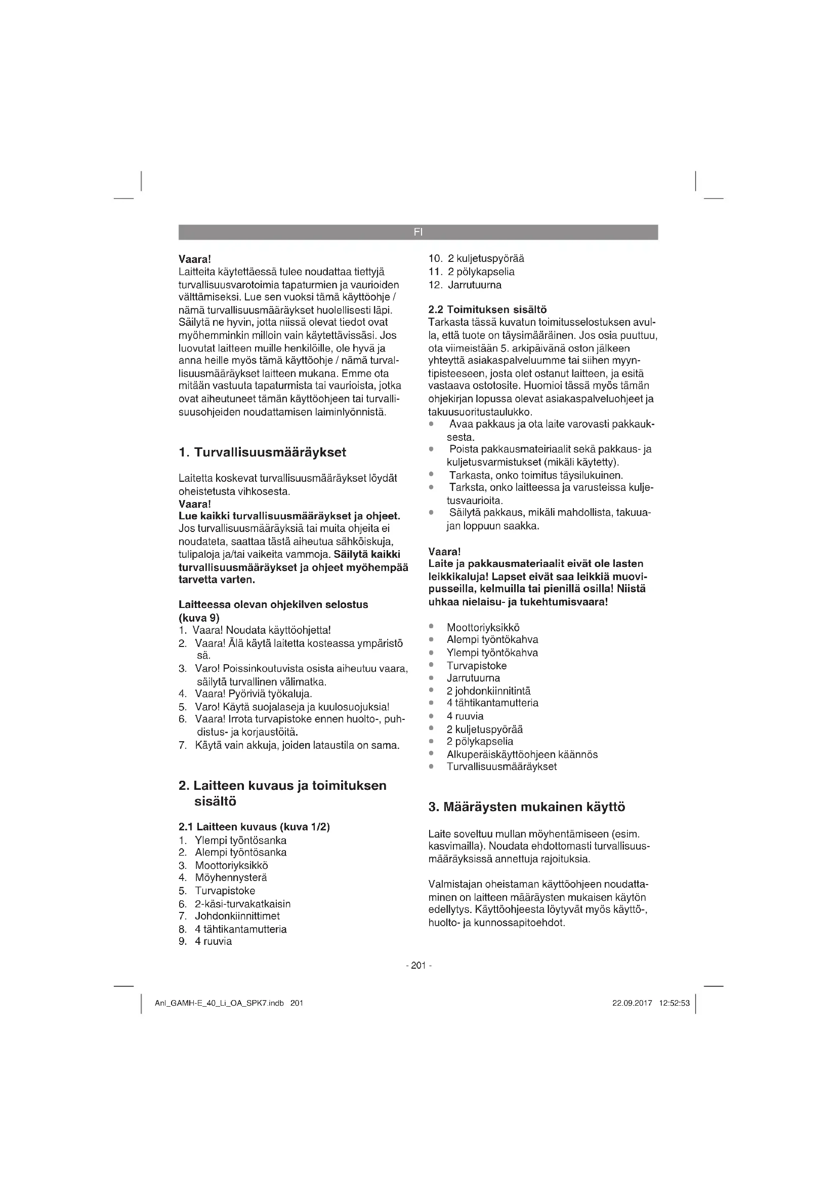 Laite soveltuu mullan möyhentämiseen (esim. kasvimailla). Noudata ehdottomasti turvallisuus- määräyksissä annettuja rajoituksia. Valmistajan oheistaman käyttöohjeen noudatta- minen on laitteen määräysten mukaisen käytön edellytys. Käyttöohjeesta löytyvät myös käyttö-, huolto- ja kunnossapitoehdot. Anl_GAMH-E_40_Li_OA_SPK7.indb 201Anl_GAMH-E_40_Li_OA_SPK7.indb 201 22.09.2017 12:52:5322.09.2017 12:52:53FI