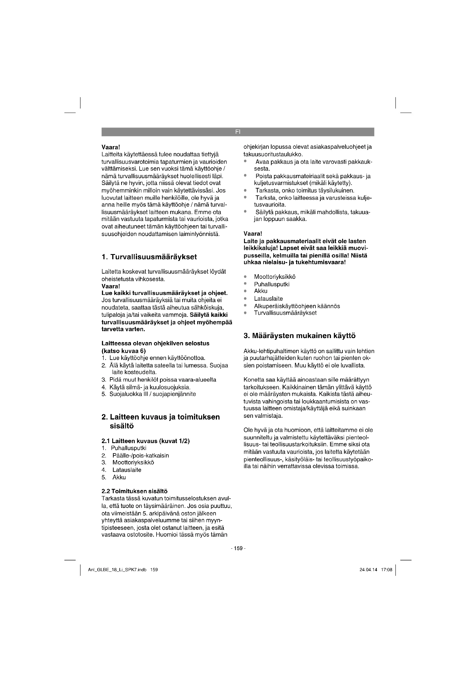 Akku-lehtipuhaltimen käyttö on sallittu vain lehtien ja puutarhajätteiden kuten ruohon tai pienten ok- sien poistamiseen. Muu käyttö ei ole luvallista. Konetta saa käyttää ainoastaan sille määrättyyn tarkoitukseen. Kaikkinainen tämän ylittävä käyttö ei ole määräysten mukaista. Kaikista tästä aiheu- tuvista vahingoista tai loukkaantumisista on vas- tuussa laitteen omistaja/käyttäjä eikä suinkaan sen valmistaja. Ole hyvä ja ota huomioon, että laitteitamme ei ole suunniteltu ja valmistettu käytettäväksi pienteol- lisuus- tai teollisuustarkoituksiin. Emme siksi ota mitään vastuuta vaurioista, jos laitetta käytetään pienteollisuus-, käsityöläis- tai teollisuustyöpaiko- illa tai näihin verrattavissa olevissa toimissa. Anl_GLBE_18_Li_SPK7.indb 159Anl_GLBE_18_Li_SPK7.indb 159 24.04.14 17:0824.04.14 17:08FI