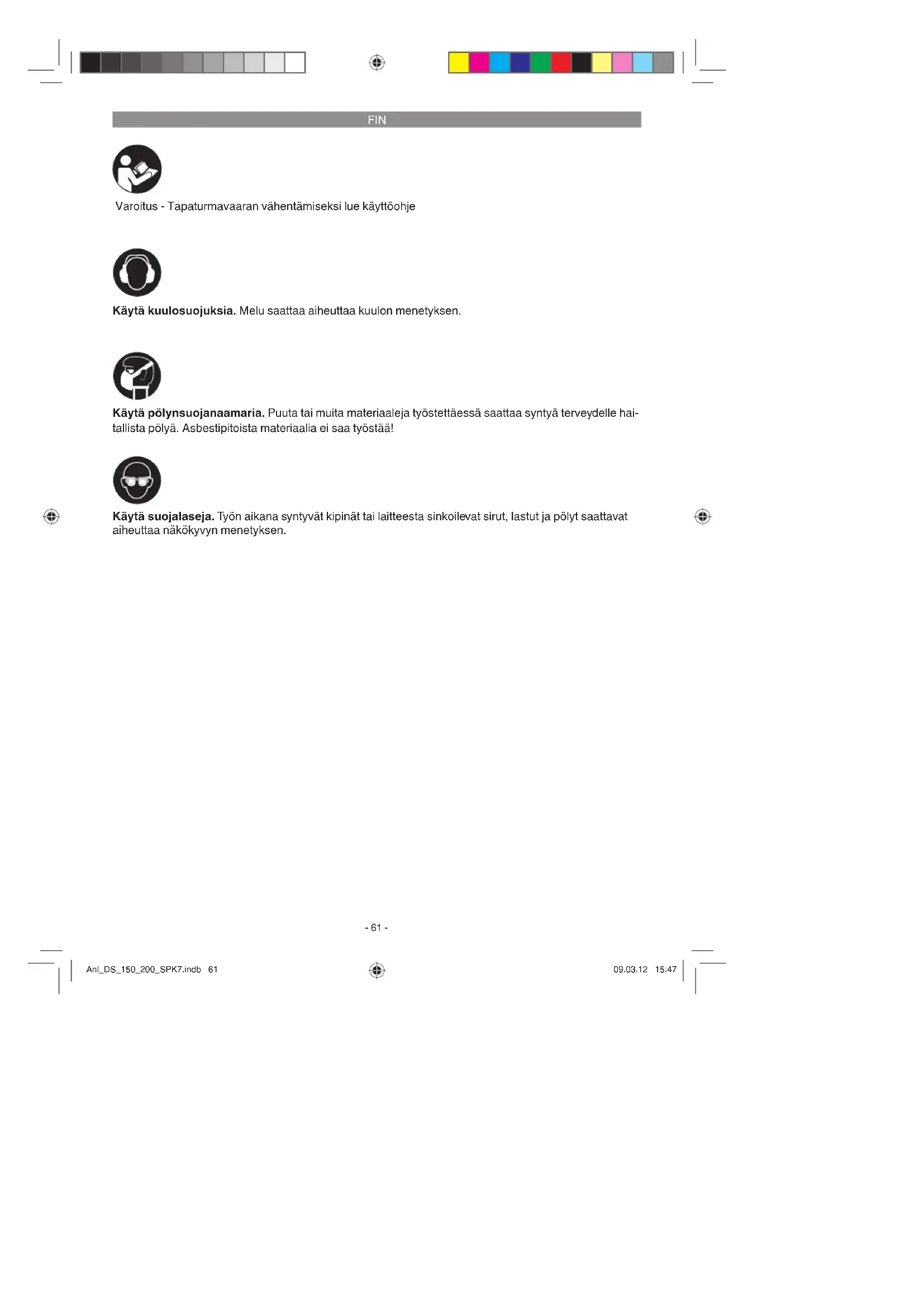 Varoitus - Tapaturmavaaran vähentämiseksi lue käyttöohje Käytä kuulosuojuksia. Melu saattaa aiheuttaa kuulon menetyksen. Käytä suojalaseja. Työn aikana syntyvät kipinät tai laitteesta sinkoilevat sirut, lastut ja pölyt saattavat aiheuttaa näkökyvyn menetyksen. Käytä pölynsuojanaamaria. Puuta tai muita materiaaleja työstettäessä saattaa syntyä terveydelle hai- tallista pölyä. Asbestipitoista materiaalia ei saa työstää! Anl_DS_150_200_SPK7.indb 61Anl_DS_150_200_SPK7.indb 61 09.03.12 15:4709.03.12 15:47FIN