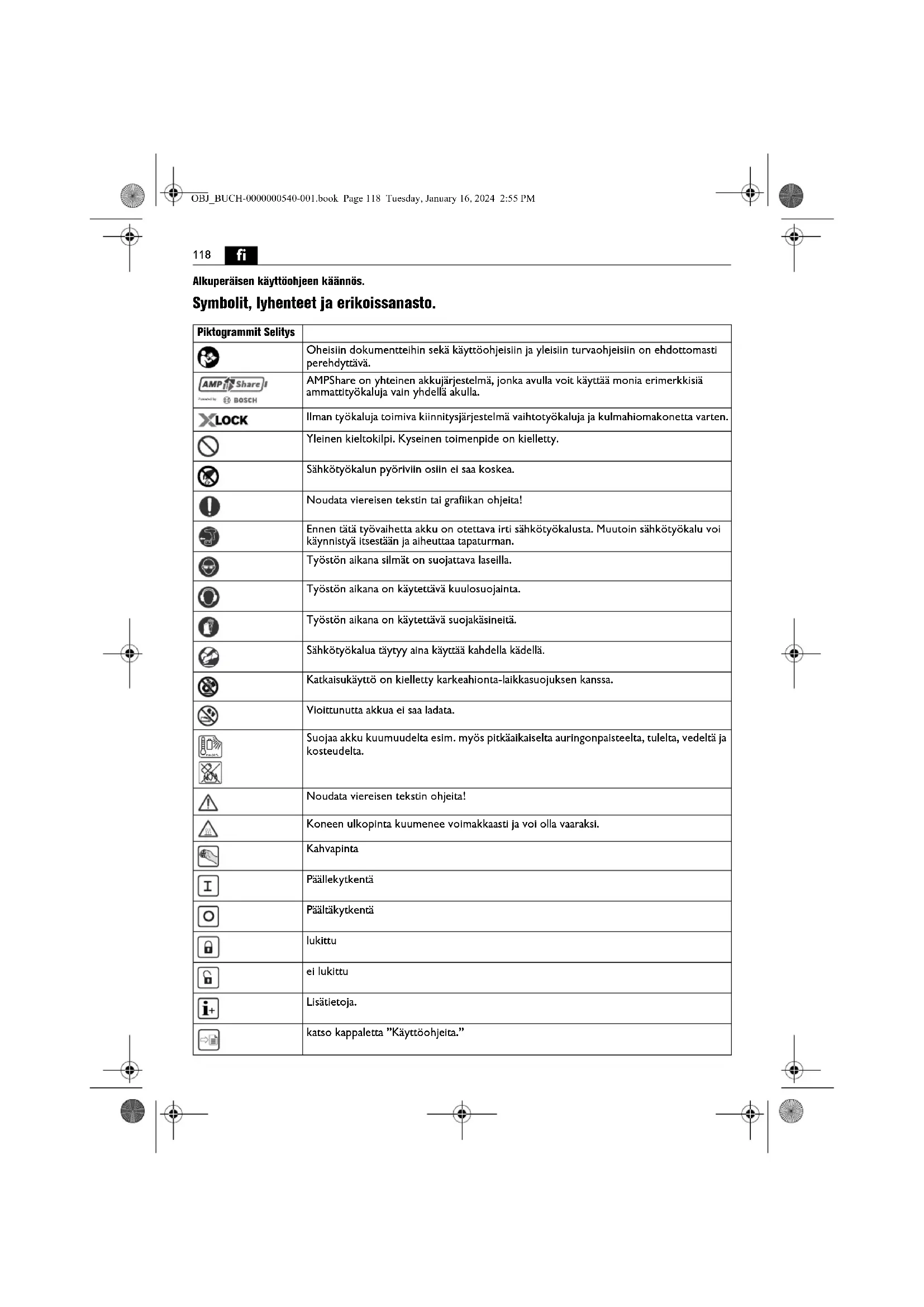 Alkuperäisen käyttöohjeen käännös. Symbolit, lyhenteet ja erikoissanasto. Piktogrammit Selitys Oheisiin dokumentteihin sekä käyttöohjeisiin ja yleisiin turvaohjeisiin on ehdottomasti perehdyttävä. AMPShare on yhteinen akkujärjestelmä, jonka avulla voit käyttää monia erimerkkisiä ammattityökaluja vain yhdellä akulla. Ilman työkaluja toimiva kiinnitysjärjestelmä vaihtotyökaluja ja kulmahiomakonetta varten. Yleinen kieltokilpi. Kyseinen toimenpide on kielletty. Sähkötyökalun pyöriviin osiin ei saa koskea. Noudata viereisen tekstin tai grafiikan ohjeita! Ennen tätä työvaihetta akku on otettava irti sähkötyökalusta. Muutoin sähkötyökalu voi käynnistyä itsestään ja aiheuttaa tapaturman. Työstön aikana silmät on suojattava laseilla. Työstön aikana on käytettävä kuulosuojainta. Työstön aikana on käytettävä suojakäsineitä. Sähkötyökalua täytyy aina käyttää kahdella kädellä. Katkaisukäyttö on kielletty karkeahionta-laikkasuojuksen kanssa. Vioittunutta akkua ei saa ladata. Suojaa akku kuumuudelta esim. myös pitkäaikaiselta auringonpaisteelta, tulelta, vedeltä ja kosteudelta. Noudata viereisen tekstin ohjeita! Koneen ulkopinta kuumenee voimakkaasti ja voi olla vaaraksi. Kahvapinta Päällekytkentä Päältäkytkentä lukittu ei lukittu Lisätietoja. katso kappaletta ”Käyttöohjeita.” max.50°C OBJ_BUCH-0000000540-001.book Page 118 Tuesday, January 16, 2024 2:55 PM119