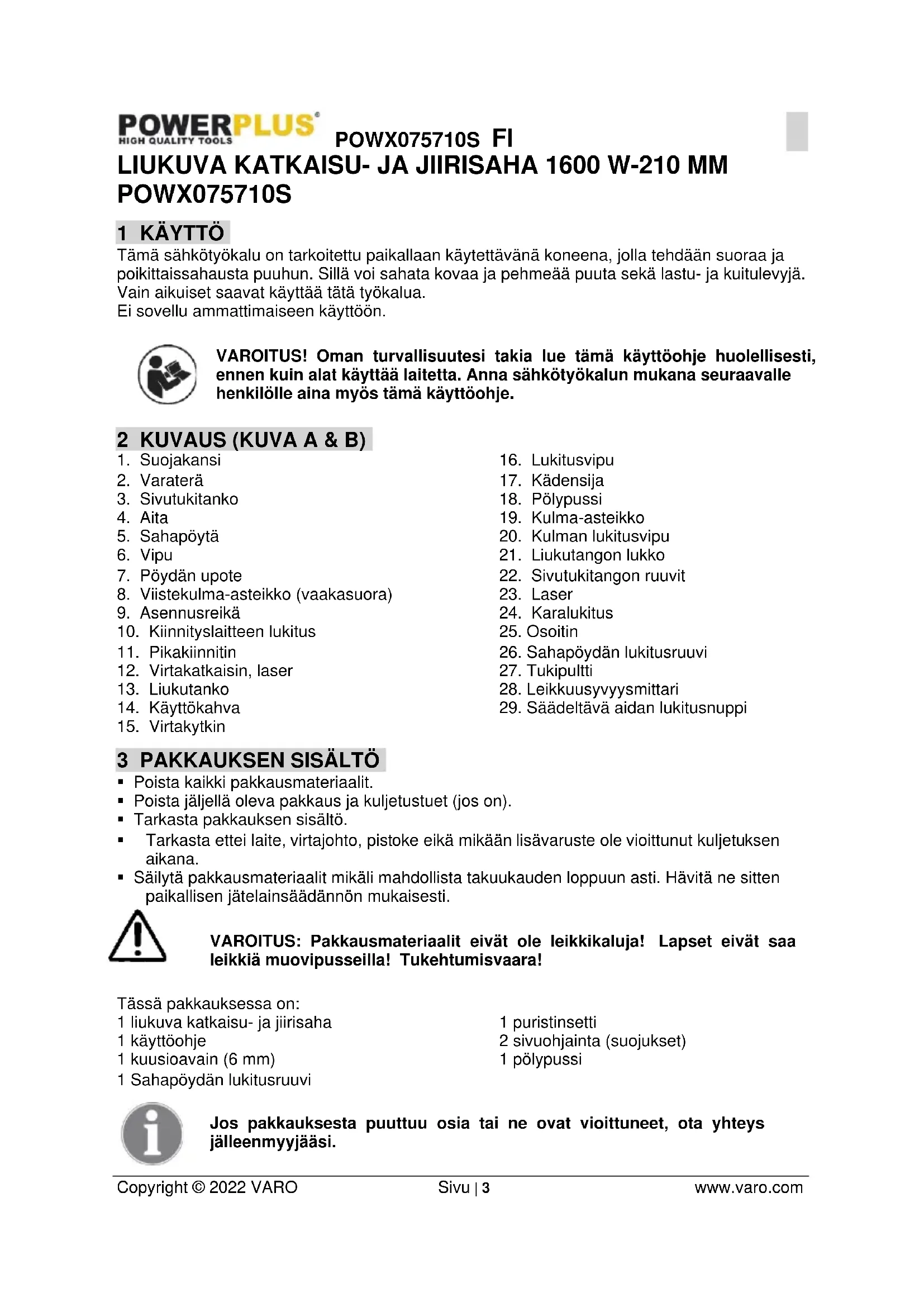 - Säilytä pakkausmateriaalit mikäli mahdollista takuukauden loppuun asti. Hävitä ne sitten paikallisen jätelainsäädännön mukaisesti. VAROITUS: Pakkausmateriaalit eivät ole leikkikaluja! Lapset eivät saa leikkiä muovipusseilla! Tukehtumisvaara! Tässä pakkauksessa on: 1 liukuva katkaisu- ja jiirisaha 1 käyttöohje 1 kuusioavain (6 mm) 1 Sahapöydän lukitusruuvi 1 puristinsetti 2 sivuohjainta (suojukset) 1 pölypussi Jos pakkauksesta puuttuu osia tai ne ovat vioittuneet, ota yhteys jälleenmyyjääsi.POWX075710S FI Copyright © 2022 VARO Sivu | 4 www.varo.com 4 SYMBOLIT Seuraavia symboleja käytetään tässä ohjekirjassa ja/tai koneen päällä: