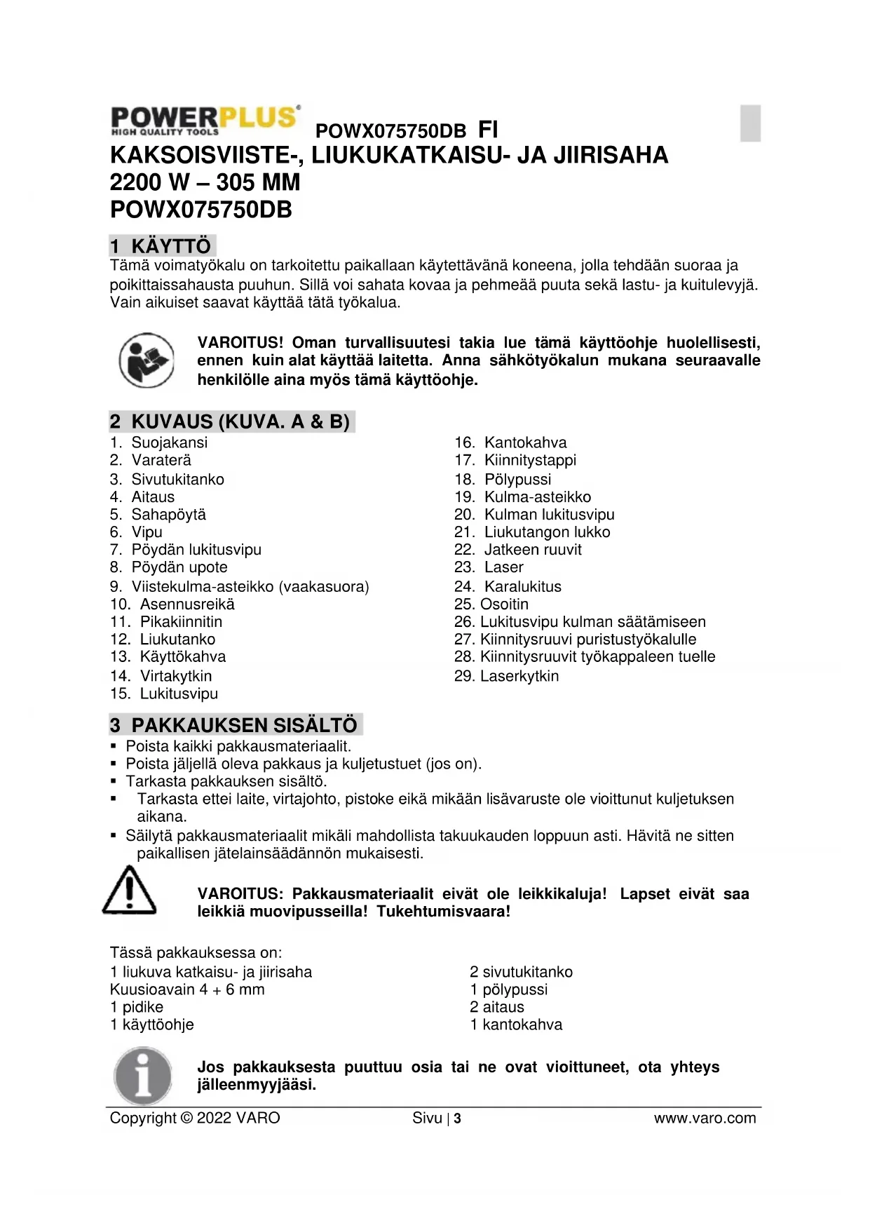 2200 W – 305 MM POWX075750DB 1 KÄYTTÖ Tämä voimatyökalu on tarkoitettu paikallaan käytettävänä koneena, jolla tehdään suoraa ja poikittaissahausta puuhun. Sillä voi sahata kovaa ja pehmeää puuta sekä lastu- ja kuitulevyjä. Vain aikuiset saavat käyttää tätä työkalua. VAROITUS! Oman turvallisuutesi takia lue tämä käyttöohje huolellisesti, ennen kuin alat käyttää laitetta. Anna sähkötyökalun mukana seuraavalle henkilölle aina myös tämä käyttöohje. 2 KUVAUS (KUVA. A & B)