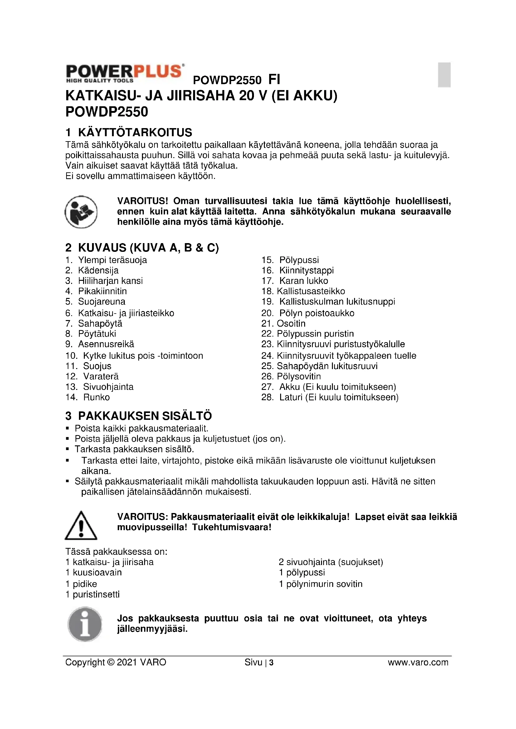 - Käytä vain sahanteriä, jotka ovat valmistajan suosittelemia ja jotka täyttävät EN847-1 vaatimukset.POWDP2550 FI Copyright © 2021 VARO Sivu | 6 www.varo.com