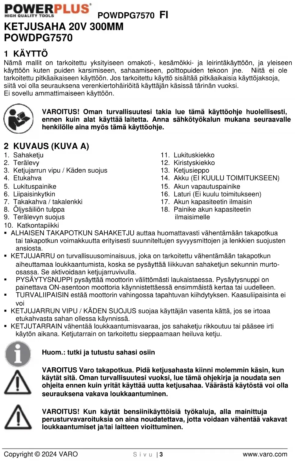 - KETJUTARRAIN vähentää loukkaantumisvaaraa, jos sahaketju rikkoutuu tai pääsee irti käytön aikana. Ketjutarrain on tarkoitettu sieppaamaan heiluva ketju. Huom.: tutki ja tutustu sahasi osiin VAROITUS Varo takapotkua. Pidä ketjusahasta kiinni molemmin käsin, kun käytät sitä. Oman turvallisuutesi vuoksi, lue tämä ohjekirja ja noudata sen ohjeita ennen kuin yrität käyttää uutta ketjusahaa. Väärästä käytöstä voi olla seurauksena vakava loukkaantuminen. VAROITUS! Kun käytät bensiinikäyttöisiä työkaluja, alla mainittuja perusturvavaroituksia on aina noudatettava, jotta voidaan vähentää vakavat loukkaantumiset ja/tai laitteen vioittuminen.POWDPG7570 FI Copyright © 2024 VARO S i v u | 4 www.varo.com