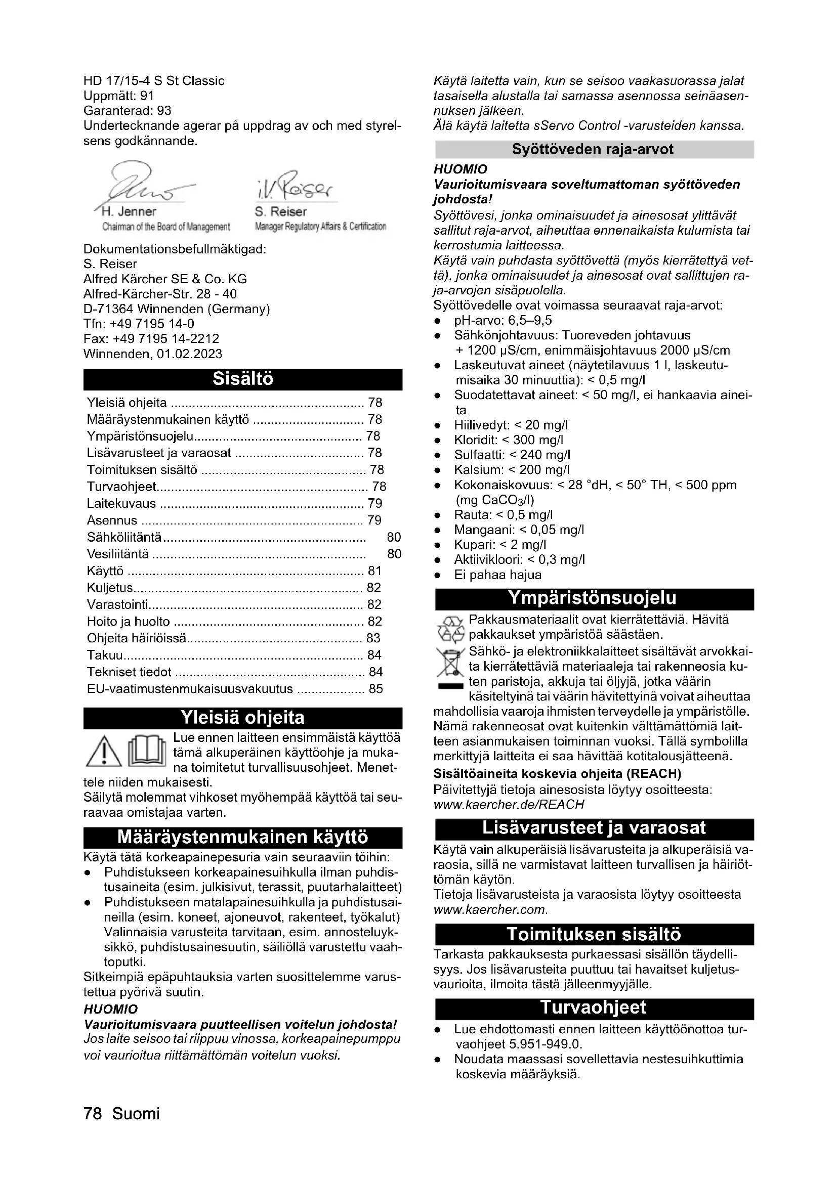 dB(A)8686919193 HD 9/20-4 S ST Classic HD 10/21-4 S ST Classic HD 10/25-4 S ST Classic HD 13/18-4 S ST Classic HD 17/15-4 S ST Classic78 Suomi HD 17/15-4 S St Classic Uppmätt: 91 Garanterad: 93 Undertecknande agerar på uppdrag av och med styrel- sens godkännande. Dokumentationsbefullmäktigad: S. Reiser Alfred Kärcher SE & Co. KG Alfred-Kärcher-Str. 28 - 40 D-71364 Winnenden (Germany) Tfn: +49 7195 14-0 Fax: +49 7195 14-2212 Winnenden, 01.02.2023 Sisältö Yleisiä ohjeita Lue ennen laitteen ensimmäistä käyttöä tämä alkuperäinen käyttöohje ja muka- na toimitetut turvallisuusohjeet. Menet- tele niiden mukaisesti. Säilytä molemmat vihkoset myöhempää käyttöä tai seu- raavaa omistajaa varten. Määräystenmukainen käyttö Käytä tätä korkeapainepesuria vain seuraaviin töihin: ● Puhdistukseen korkeapainesuihkulla ilman puhdis- tusaineita (esim. julkisivut, terassit, puutarhalaitteet) ● Puhdistukseen matalapainesuihkulla ja puhdistusai- neilla (esim. koneet, ajoneuvot, rakenteet, työkalut) Valinnaisia varusteita tarvitaan, esim. annosteluyk- sikkö, puhdistusainesuutin, säiliöllä varustettu vaah- toputki. Sitkeimpiä epäpuhtauksia varten suosittelemme varus- tettua pyörivä suutin. HUOMIO Vaurioitumisvaara puutteellisen voitelun johdosta! Jos laite seisoo tai riippuu vinossa, korkeapainepumppu voi vaurioitua riittämättömän voitelun vuoksi. Käytä laitetta vain, kun se seisoo vaakasuorassa jalat tasaisella alustalla tai samassa asennossa seinäasen- nuksen jälkeen. Älä käytä laitetta sServo Control -varusteiden kanssa. Syöttöveden raja-arvot HUOMIO Vaurioitumisvaara soveltumattoman syöttöveden johdosta! Syöttövesi, jonka ominaisuudet ja ainesosat ylittävät sallitut raja-arvot, aiheuttaa ennenaikaista kulumista tai kerrostumia laitteessa. Käytä vain puhdasta syöttövettä (myös kierrätettyä vet- tä), jonka ominaisuudet ja ainesosat ovat sallittujen ra- ja-arvojen sisäpuolella. Syöttövedelle ovat voimassa seuraavat raja-arvot: ● pH-arvo: 6,5–9,5 ● Sähkönjohtavuus: Tuoreveden johtavuus + 1200 µS/cm, enimmäisjohtavuus 2000 µS/cm ● Laskeutuvat aineet (näytetilavuus 1 l, laskeutu- misaika 30 minuuttia): < 0,5 mg/l ● Suodatettavat aineet: < 50 mg/l, ei hankaavia ainei-