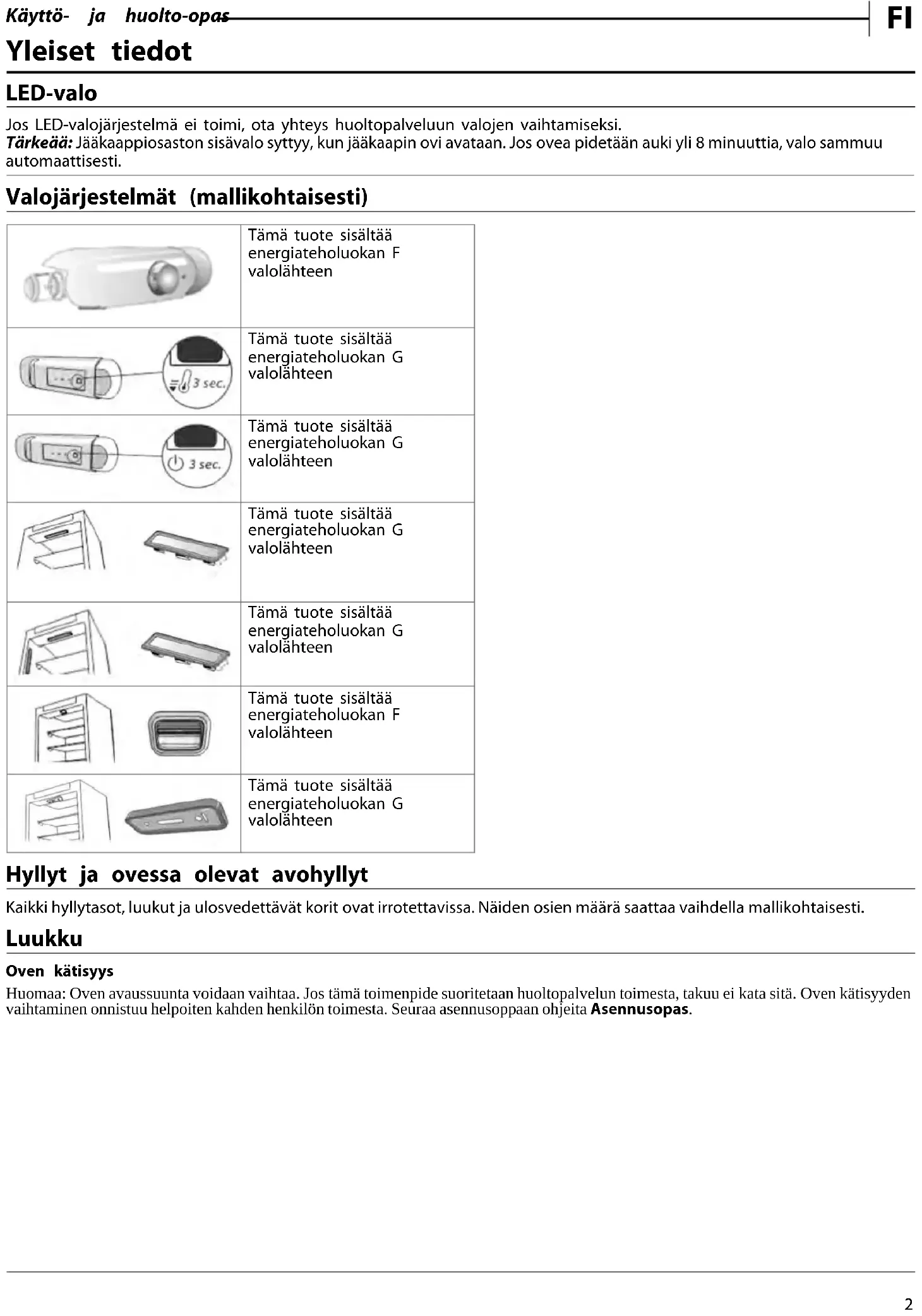 Yleiset tiedot LED-valo Jos LED-valojärjestelmä ei toimi, ota yhteys huoltopalveluun valojen vaihtamiseksi. Tärkeää: Jääkaappiosaston sisävalo syttyy, kun jääkaapin ovi avataan. Jos ovea pidetään auki yli 8 minuuttia, valo sammuu automaattisesti. Valojärjestelmät (mallikohtaisesti) Tämä tuote sisältää energiateholuokan F valolähteen Tämä tuote sisältää energiateholuokan G valolähteen Tämä tuote sisältää energiateholuokan G valolähteen Tämä tuote sisältää energiateholuokan G valolähteen Tämä tuote sisältää energiateholuokan G valolähteen Tämä tuote sisältää energiateholuokan F valolähteen Tämä tuote sisältää energiateholuokan G valolähteen Hyllyt ja ovessa olevat avohyllyt Kaikki hyllytasot, luukut ja ulosvedettävät korit ovat irrotettavissa. Näiden osien määrä saattaa vaihdella mallikohtaisesti. Luukku Oven kätisyys Huomaa: Oven avaussuunta voidaan vaihtaa. Jos tämä toimenpide suoritetaan huoltopalvelun toimesta, takuu ei kata sitä. Oven kätisyyden vaihtaminen onnistuu helpoiten kahden henkilön toimesta. Seuraa asennusoppaan ohjeita Asennusopas.Käyttö- ja huolto-opas