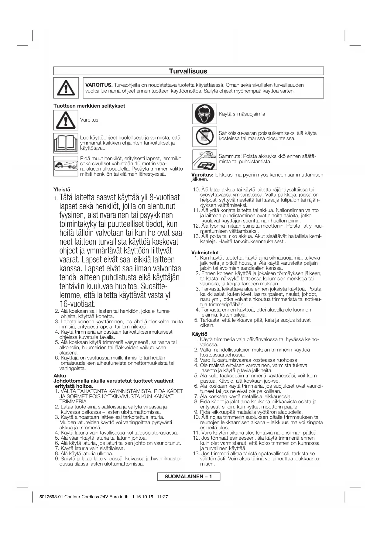 ) 1,5 Vekt (kg) 3,2 5012693-01 Contour Cordless 24V Euro.indb 5 16.10.15 11:27SUOMALAINEN – 1 Turvallisuus VAROITUS. Turvaohjeita on noudatettava tuotetta käytettäessä. Oman sekä sivullisten turvallisuuden vuoksi lue nämä ohjeet ennen tuotteen käyttöönottoa. Säilytä ohjeet myöhempää käyttöä varten. Tuotteen merkkien selitykset Varoitus Lue käyttöohjeet huolellisesti ja varmista, että ymmärrät kaikkien ohjainten tarkoitukset ja käyttötavat. Pidä muut henkilöt, erityisesti lapset, lemmikit sekä sivulliset vähintään 10 metrin vaa- ra-alueen ulkopuolella. Pysäytä trimmeri välittö- mästi henkilön tai eläimen lähestyessä. Käytä silmäsuojaimia Sähköiskuvaaran poissulkemiseksi älä käytä kosteissa tai märissä olosuhteissa. Sammuta! Poista akkuyksikkö ennen säätä- mistä tai puhdistamista. Varoitus: leikkuusiima pyörii myös koneen sammuttamisen jälkeen. 360º 10m Yleistä