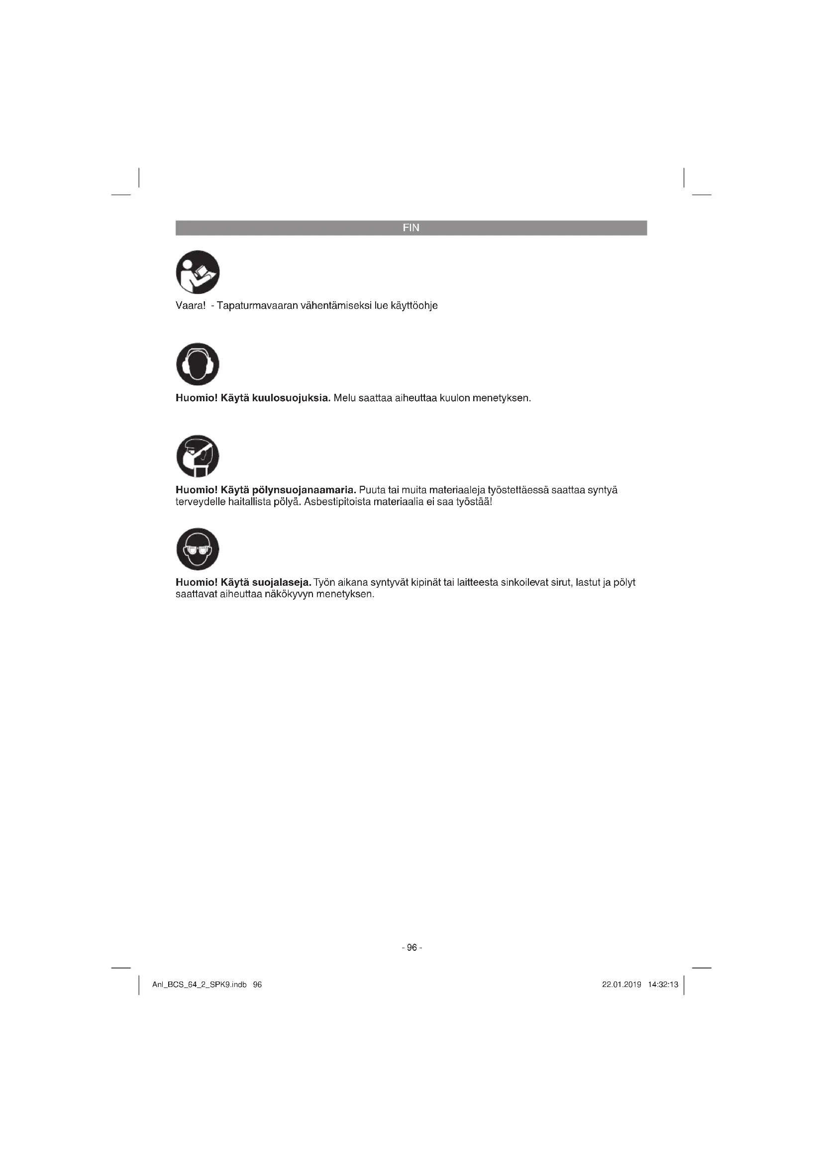 Vaara! - Tapaturmavaaran vähentämiseksi lue käyttöohje Huomio! Käytä kuulosuojuksia. Melu saattaa aiheuttaa kuulon menetyksen. Huomio! Käytä suojalaseja. Työn aikana syntyvät kipinät tai laitteesta sinkoilevat sirut, lastut ja pölyt saattavat aiheuttaa näkökyvyn menetyksen. Huomio! Käytä pölynsuojanaamaria. Puuta tai muita materiaaleja työstettäessä saattaa syntyä terveydelle haitallista pölyä. Asbestipitoista materiaalia ei saa työstää! Anl_BCS_64_2_SPK9.indb 96Anl_BCS_64_2_SPK9.indb 96 22.01.2019 14:32:1322.01.2019 14:32:13FIN