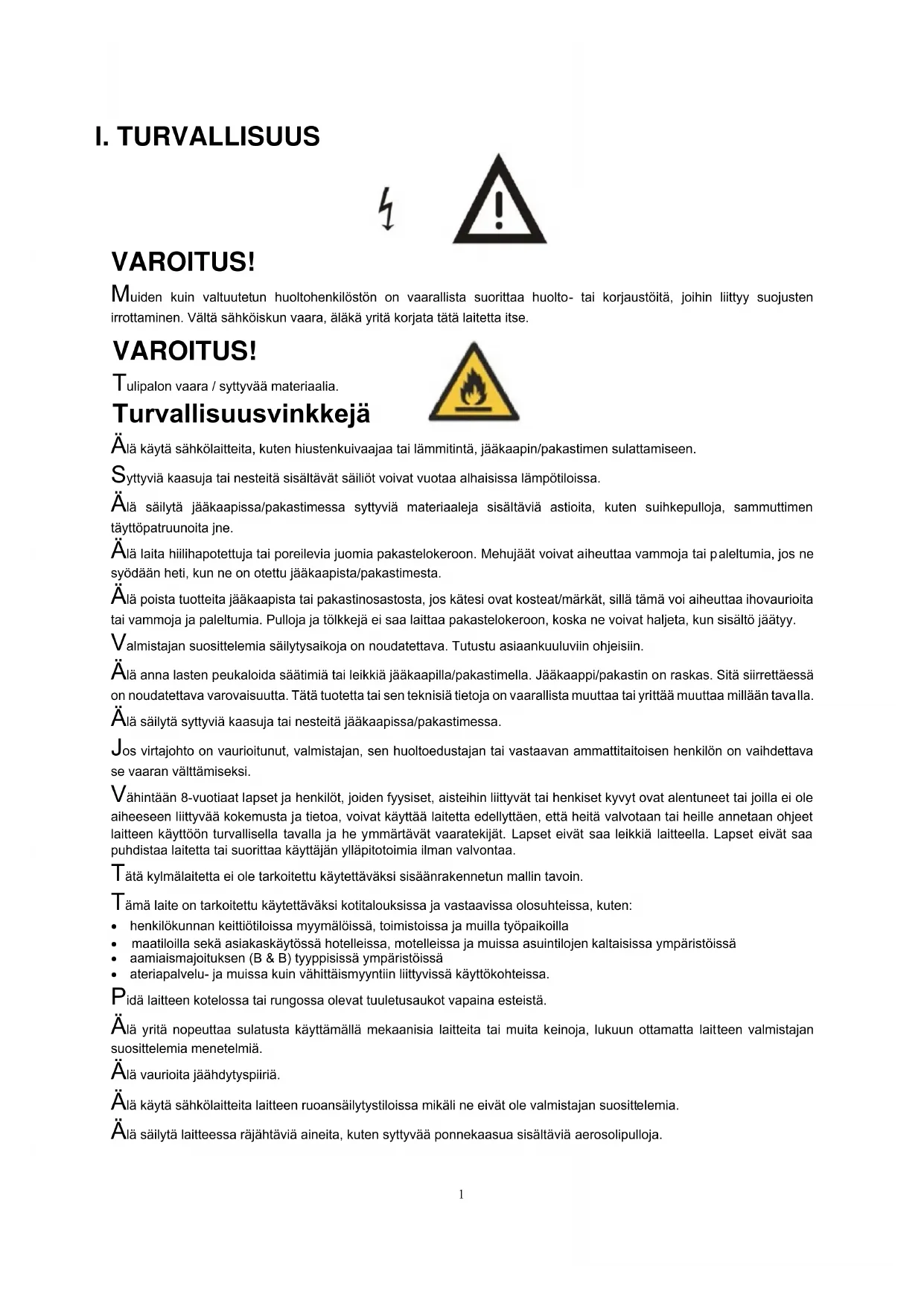 VAROITUS! Muiden kuin valtuutetun huoltohenkilöstön on vaarallista suorittaa huolto- tai korjaustöitä, joihin liittyy suojusten irrottaminen. Vältä sähköiskun vaara, äläkä yritä korjata tätä laitetta itse. VAROITUS! Tulipalon vaara / syttyvää materiaalia. Turvallisuusvinkkejä Älä käytä sähkölaitteita, kuten hiustenkuivaajaa tai lämmitintä, jääkaapin/pakastimen sulattamiseen. Syttyviä kaasuja tai nesteitä sisältävät säiliöt voivat vuotaa alhaisissa lämpötiloissa. Älä säilytä jääkaapissa/pakastimessa syttyviä materiaaleja sisältäviä astioita, kuten suihkepulloja, sammuttimen täyttöpatruunoita jne. Älä laita hiilihapotettuja tai poreilevia juomia pakastelokeroon. Mehujäät voivat aiheuttaa vammoja tai paleltumia, jos ne syödään heti, kun ne on otettu jääkaapista/pakastimesta. Älä poista tuotteita jääkaapista tai pakastinosastosta, jos kätesi ovat kosteat/märkät, sillä tämä voi aiheuttaa ihovaurioita tai vammoja ja paleltumia. Pulloja ja tölkkejä ei saa laittaa pakastelokeroon, koska ne voivat haljeta, kun sisältö jäätyy. Valmistajan suosittelemia säilytysaikoja on noudatettava. Tutustu asiaankuuluviin ohjeisiin. Älä anna lasten peukaloida säätimiä tai leikkiä jääkaapilla/pakastimella. Jääkaappi/pakastin on raskas. Sitä siirrettäessä on noudatettava varovaisuutta. Tätä tuotetta tai sen teknisiä tietoja on vaarallista muuttaa tai yrittää muuttaa millään tavalla. Älä säilytä syttyviä kaasuja tai nesteitä jääkaapissa/pakastimessa. Jos virtajohto on vaurioitunut, valmistajan, sen huoltoedustajan tai vastaavan ammattitaitoisen henkilön on vaihdettava se vaaran välttämiseksi. Vähintään 8-vuotiaat lapset ja henkilöt, joiden fyysiset, aisteihin liittyvät tai henkiset kyvyt ovat alentuneet tai joilla ei ole aiheeseen liittyvää kokemusta ja tietoa, voivat käyttää laitetta edellyttäen, että heitä valvotaan tai heille annetaan ohjeet laitteen käyttöön turvallisella tavalla ja he ymmärtävät vaaratekijät. Lapset eivät saa leikkiä laitteella. Lapset eivät saa puhdistaa laitetta tai suorittaa käyttäjän ylläpitotoimia ilman valvontaa. Tätä kylmälaitetta ei ole tarkoitettu käytettäväksi sisäänrakennetun mallin tavoin. Tämä laite on tarkoitettu käytettäväksi kotitalouksissa ja vastaavissa olosuhteissa, kuten: