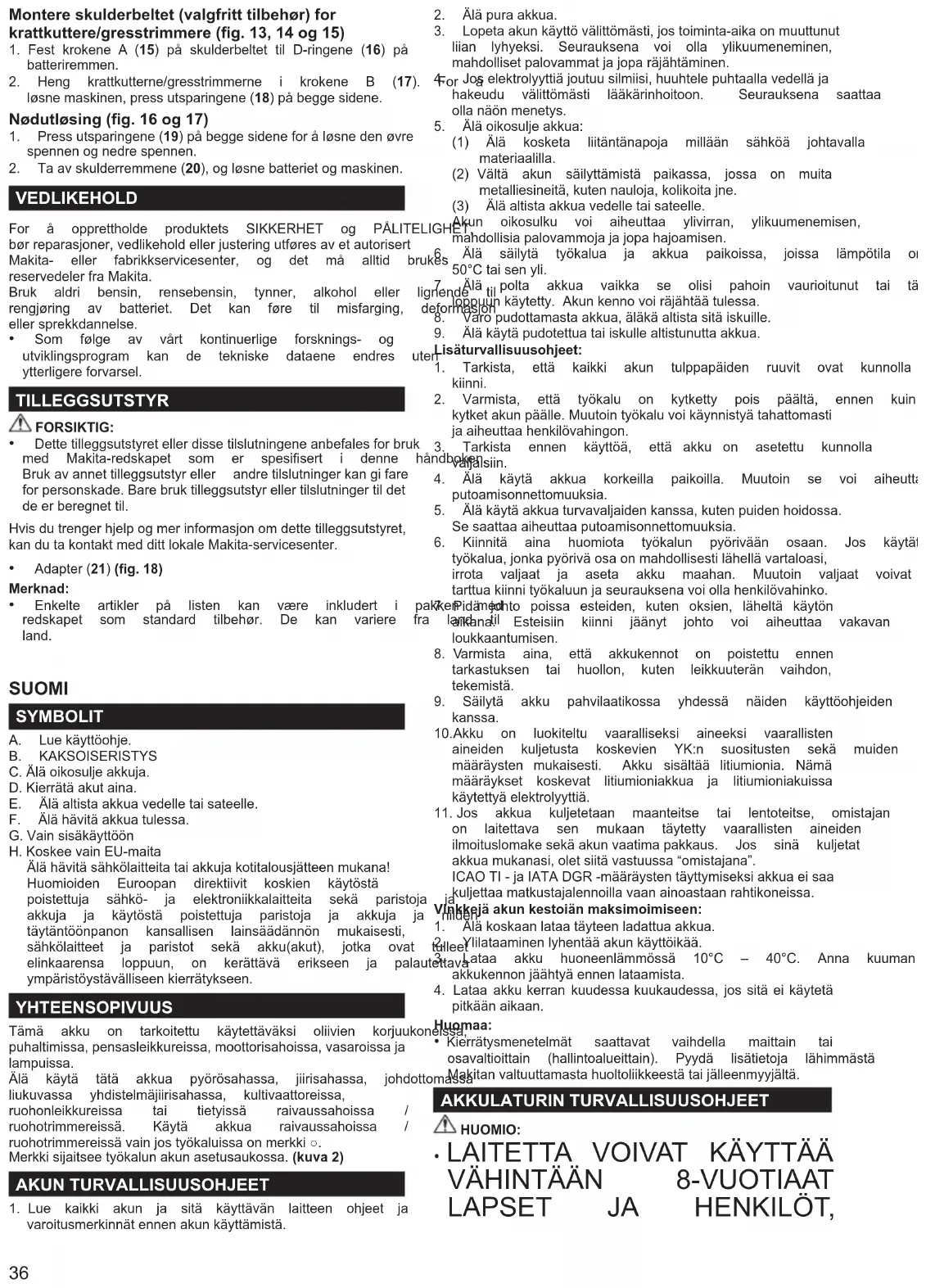 Batteri BL36120A Original instruksjonshåndbok S34 FIN Akku BL36120A Alkuperäinen käyttöohje S36