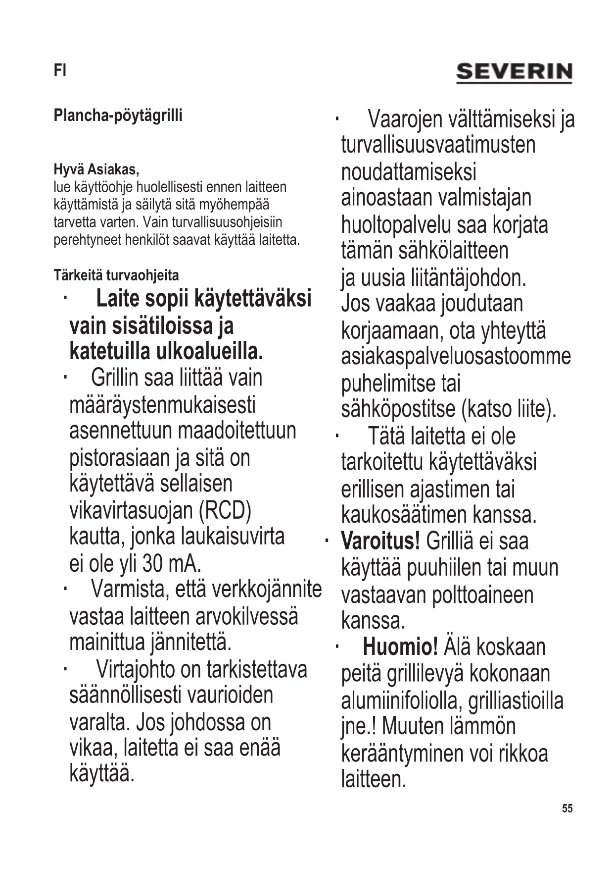 Plancha-pöytägrilli Hyvä Asiakas, lue käyttöohje huolellisesti ennen laitteen käyttämistä ja säilytä sitä myöhempää tarvetta varten. Vain turvallisuusohjeisiin perehtyneet henkilöt saavat käyttää laitetta. Tärkeitä turvaohjeita ∙ Laite sopii käytettäväksi vain sisätiloissa ja katetuilla ulkoalueilla. ∙ Grillin saa liittää vain määräystenmukaisesti asennettuun maadoitettuun pistorasiaan ja sitä on käytettävä sellaisen vikavirtasuojan (RCD) kautta, jonka laukaisuvirta ei ole yli 30 mA. ∙ Varmista, että verkkojännite vastaa laitteen arvokilvessä mainittua jännitettä. ∙ Virtajohto on tarkistettava säännöllisesti vaurioiden varalta. Jos johdossa on vikaa, laitetta ei saa enää käyttää. ∙ Vaarojen välttämiseksi ja turvallisuusvaatimusten noudattamiseksi ainoastaan valmistajan huoltopalvelu saa korjata tämän sähkölaitteen ja uusia liitäntäjohdon. Jos vaakaa joudutaan korjaamaan, ota yhteyttä asiakaspalveluosastoomme puhelimitse tai sähköpostitse (katso liite). ∙ Tätä laitetta ei ole tarkoitettu käytettäväksi erillisen ajastimen tai kaukosäätimen kanssa. ∙ Varoitus! Grilliä ei saa käyttää puuhiilen tai muun vastaavan polttoaineen kanssa. ∙ Huomio! Älä koskaan peitä grillilevyä kokonaan alumiinifoliolla, grilliastioilla jne.! Muuten lämmön kerääntyminen voi rikkoa laitteen. FI56 104 x 142 mm ∙ Älä laita grilliin nesteitä.