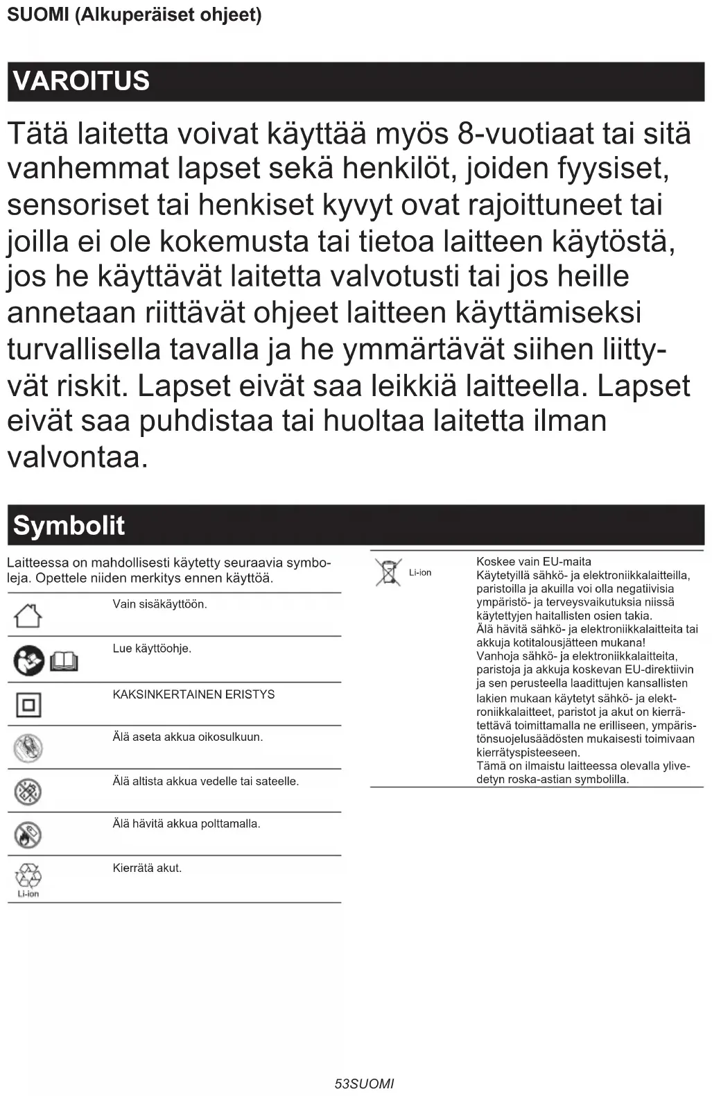 ► Fig.553 SUOMI SUOMI (Alkuperäiset ohjeet) VAROITUS Tätä laitetta voivat käyttää myös 8-vuotiaat tai sitä vanhemmat lapset sekä henkilöt, joiden fyysiset, sensoriset tai henkiset kyvyt ovat rajoittuneet tai joilla ei ole kokemusta tai tietoa laitteen käytöstä, jos he käyttävät laitetta valvotusti tai jos heille annetaan riittävät ohjeet laitteen käyttämiseksi turvallisella tavalla ja he ymmärtävät siihen liitty- vät riskit. Lapset eivät saa leikkiä laitteella. Lapset eivät saa puhdistaa tai huoltaa laitetta ilman valvontaa. Symbolit Laitteessa on mahdollisesti käytetty seuraavia symbo- leja. Opettele niiden merkitys ennen käyttöä. Vain sisäkäyttöön. Lue käyttöohje. KAKSINKERTAINEN ERISTYS Älä aseta akkua oikosulkuun. Älä altista akkua vedelle tai sateelle. Älä hävitä akkua polttamalla. Kierrätä akut. Li-ion Koskee vain EU-maita Käytetyillä sähkö- ja elektroniikkalaitteilla, paristoilla ja akuilla voi olla negatiivisia ympäristö- ja terveysvaikutuksia niissä käytettyjen haitallisten osien takia. Älä hävitä sähkö- ja elektroniikkalaitteita tai akkuja kotitalousjätteen mukana! Vanhoja sähkö- ja elektroniikkalaitteita, paristoja ja akkuja koskevan EU-direktiivin ja sen perusteella laadittujen kansallisten lakien mukaan käytetyt sähkö- ja elekt- roniikkalaitteet, paristot ja akut on kierrä- tettävä toimittamalla ne erilliseen, ympäris- tönsuojelusäädösten mukaisesti toimivaan kierrätyspisteeseen. Tämä on ilmaistu laitteessa olevalla ylive- detyn roska-astian symbolilla.54 SUOMI Valmis lataukseen. Viivästytetty lataus (akku jäähtyy, akku liian kylmä tai odottaa latausta). Latautuu (0 - 80 %). Latautuu (80 - 100 %). Lataus valmis. Latautuu (jäähdytyspoikkeama). Viallinen akku. HUOMIO