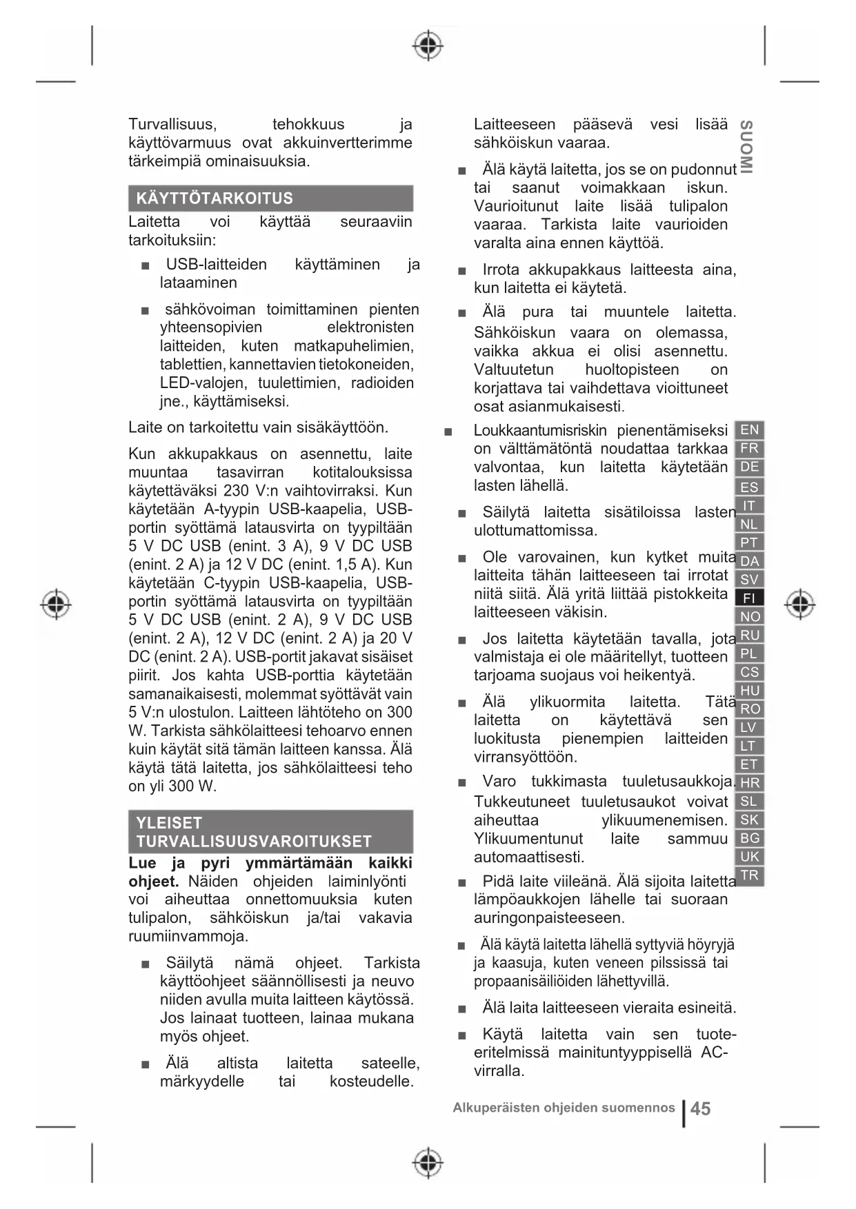 Laitetta voi käyttää seuraaviin tarkoituksiin: ■ USB-laitteiden käyttäminen ja lataaminen ■ sähkövoiman toimittaminen pienten yhteensopivien elektronisten laitteiden, kuten matkapuhelimien, tablettien, kannettavien tietokoneiden, LED-valojen, tuulettimien, radioiden jne., käyttämiseksi. Laite on tarkoitettu vain sisäkäyttöön. Kun akkupakkaus on asennettu, laite muuntaa tasavirran kotitalouksissa käytettäväksi 230 V:n vaihtovirraksi. Kun käytetään A-tyypin USB-kaapelia, USB- portin syöttämä latausvirta on tyypiltään 5 V DC USB (enint. 3 A), 9 V DC USB (enint. 2 A) ja 12 V DC (enint. 1,5 A). Kun käytetään C-tyypin USB-kaapelia, USB- portin syöttämä latausvirta on tyypiltään 5 V DC USB (enint. 2 A), 9 V DC USB (enint. 2 A), 12 V DC (enint. 2 A) ja 20 V DC (enint. 2 A). USB-portit jakavat sisäiset piirit. Jos kahta USB-porttia käytetään samanaikaisesti, molemmat syöttävät vain 5 V:n ulostulon. Laitteen lähtöteho on 300 W. Tarkista sähkölaitteesi tehoarvo ennen kuin käytät sitä tämän laitteen kanssa. Älä käytä tätä laitetta, jos sähkölaitteesi teho on yli 300 W. YLEISET TURVALLISUUSVAROITUKSET Lue ja pyri ymmärtämään kaikki ohjeet. Näiden ohjeiden laiminlyönti voi aiheuttaa onnettomuuksia kuten tulipalon, sähköiskun ja/tai vakavia ruumiinvammoja. ■ Säilytä nämä ohjeet. Tarkista käyttöohjeet säännöllisesti ja neuvo niiden avulla muita laitteen käytössä. Jos lainaat tuotteen, lainaa mukana myös ohjeet. ■ Älä altista laitetta sateelle, märkyydelle tai kosteudelle. Laitteeseen pääsevä vesi lisää sähköiskun vaaraa. ■ Älä käytä laitetta, jos se on pudonnut tai saanut voimakkaan iskun. Vaurioitunut laite lisää tulipalon vaaraa. Tarkista laite vaurioiden varalta aina ennen käyttöä. ■ Irrota akkupakkaus laitteesta aina, kun laitetta ei käytetä. ■ Älä pura tai muuntele laitetta. Sähköiskun vaara on olemassa, vaikka akkua ei olisi asennettu. Valtuutetun huoltopisteen on korjattava tai vaihdettava vioittuneet osat asianmukaisesti. ■ Loukkaantumisriskin pienentämiseksi on välttämätöntä noudattaa tarkkaa valvontaa, kun laitetta käytetään lasten lähellä. ■ Säilytä laitetta sisätiloissa lasten ulottumattomissa. ■ Ole varovainen, kun kytket muita laitteita tähän laitteeseen tai irrotat niitä siitä. Älä yritä liittää pistokkeita laitteeseen väkisin. ■ Jos laitetta käytetään tavalla, jota valmistaja ei ole määritellyt, tuotteen tarjoama suojaus voi heikentyä. ■ Älä ylikuormita laitetta. Tätä laitetta on käytettävä sen luokitusta pienempien laitteiden virransyöttöön. ■ Varo tukkimasta tuuletusaukkoja. Tukkeutuneet tuuletusaukot voivat aiheuttaa ylikuumenemisen. Ylikuumentunut laite sammuu automaattisesti. ■ Pidä laite viileänä. Älä sijoita laitetta lämpöaukkojen lähelle tai suoraan auringonpaisteeseen. ■ Älä käytä laitetta lähellä syttyviä höyryjä ja kaasuja, kuten veneen pilssissä tai propaanisäiliöiden lähettyvillä. ■ Älä laita laitteeseen vieraita esineitä. ■ Käytä laitetta vain sen tuote- eritelmissä mainituntyyppisellä AC- virralla.