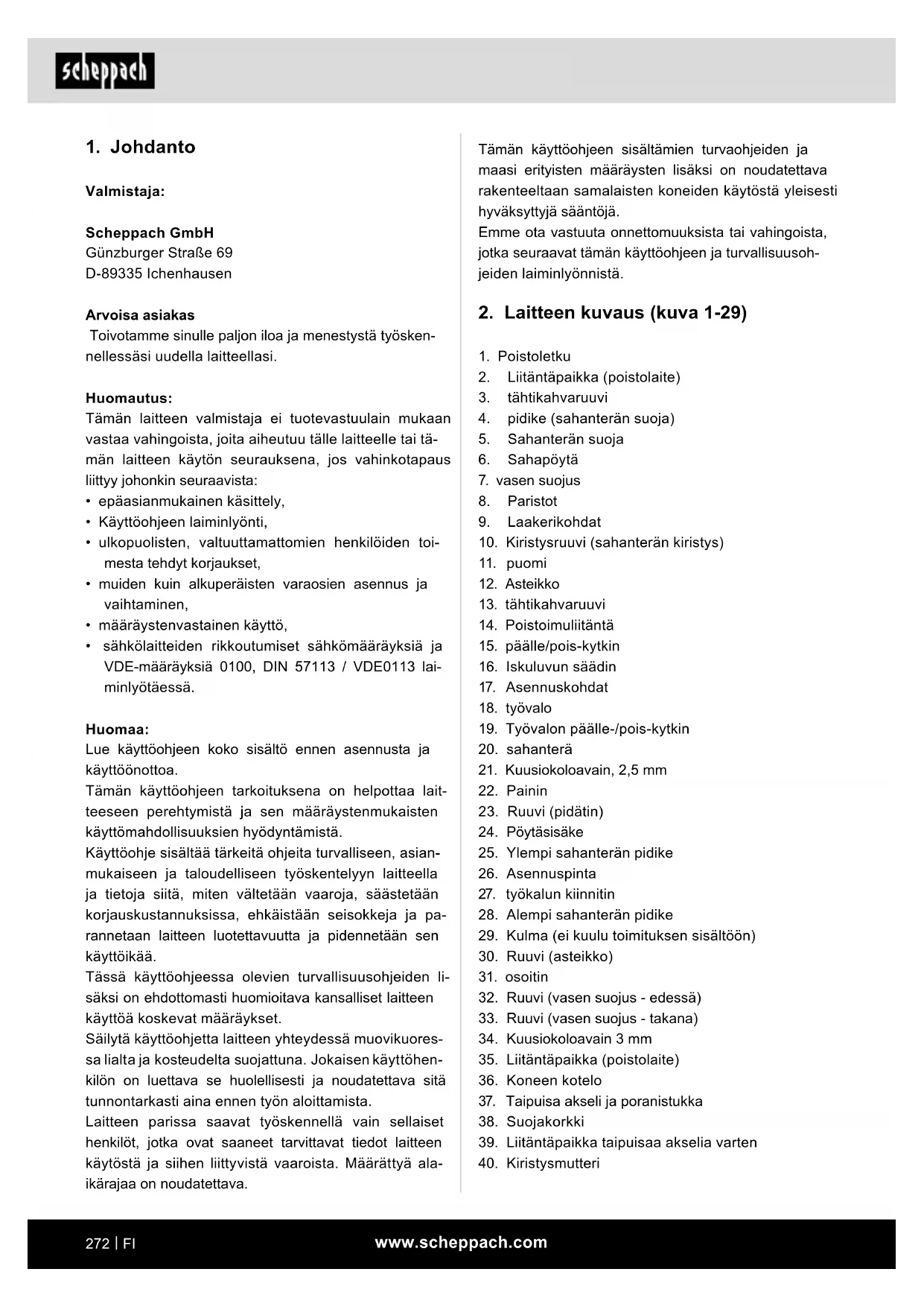 Valmistaja: Scheppach GmbH Günzburger Straße 69 D-89335 Ichenhausen Arvoisa asiakas Toivotamme sinulle paljon iloa ja menestystä työsken- nellessäsi uudella laitteellasi. Huomautus: Tämän laitteen valmistaja ei tuotevastuulain mukaan vastaa vahingoista, joita aiheutuu tälle laitteelle tai tä- män laitteen käytön seurauksena, jos vahinkotapaus liittyy johonkin seuraavista:
