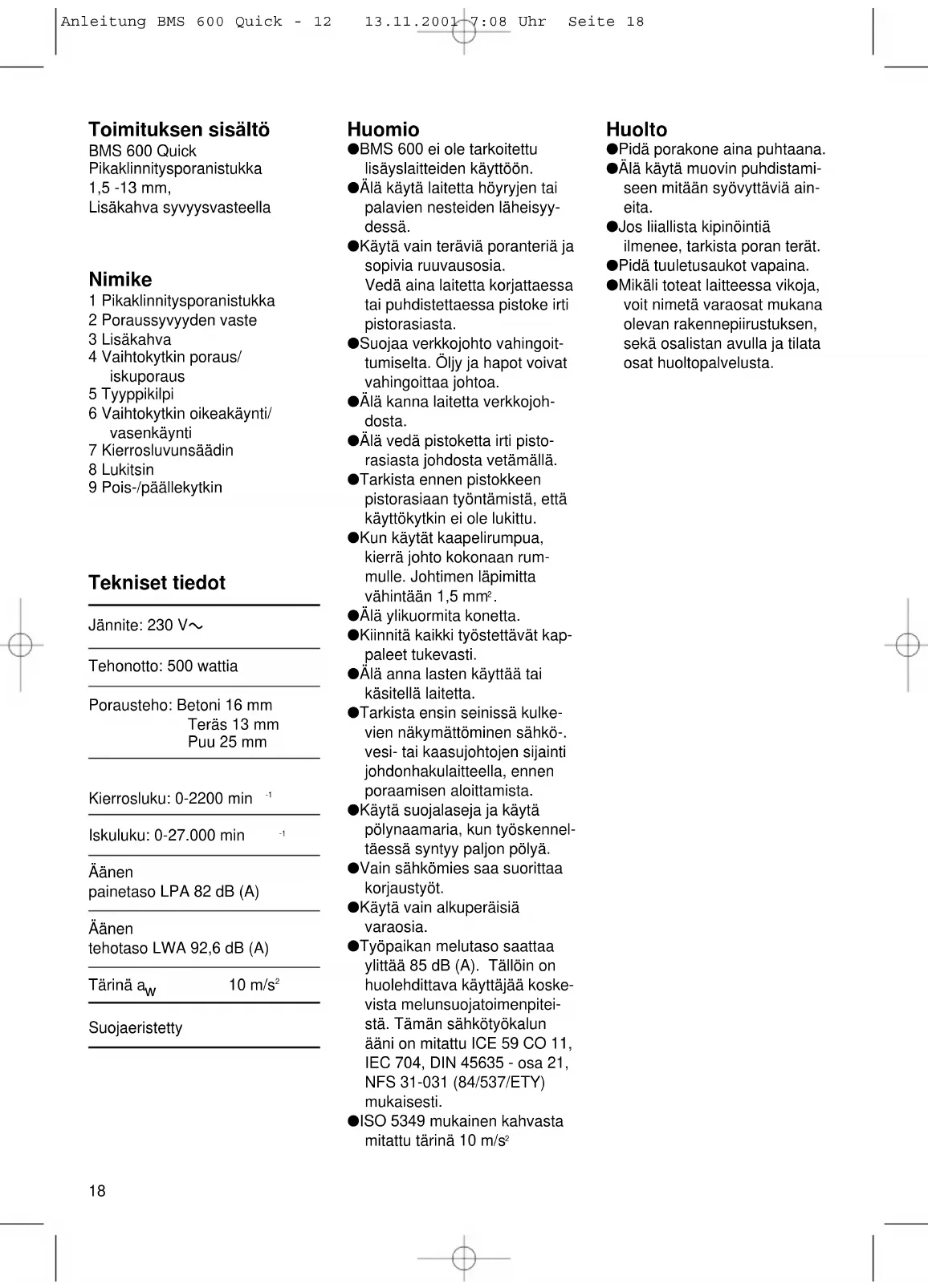Huolto ● Pidä porakone aina puhtaana. ● Älä käytä muovin puhdistami- seen mitään syövyttäviä ain- eita. ● Jos liiallista kipinöintiä ilmenee, tarkista poran terät. ● Pidä tuuletusaukot vapaina. ● Mikäli toteat laitteessa vikoja, voit nimetä varaosat mukana olevan rakennepiirustuksen, sekä osalistan avulla ja tilata osat huoltopalvelusta. Anleitung BMS 600 Quick - 12 13.11.2001 7:08 Uhr Seite 1819