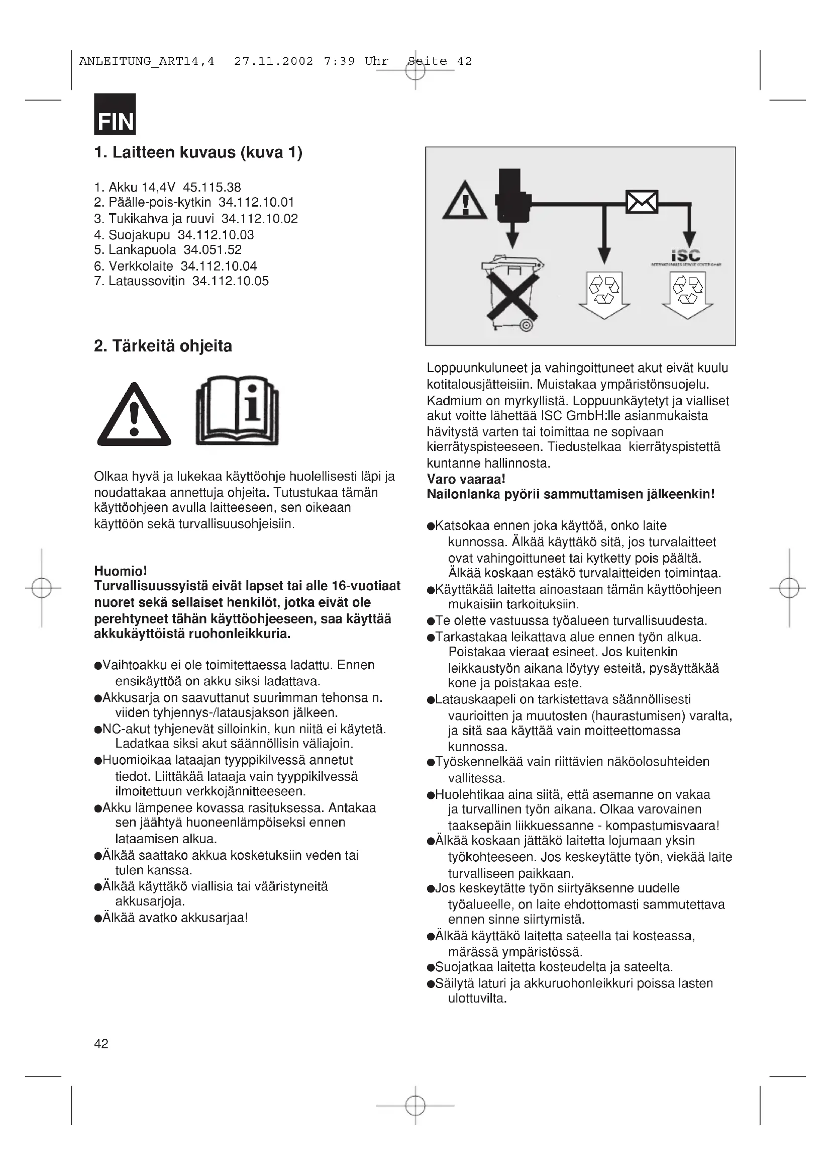 1. Laitteen kuvaus (kuva 1)1. Akku 14,4V 45.115.382. Päälle-pois-kytkin 34.112.10.013. Tukikahva ja ruuvi 34.112.10.024. Suojakupu 34.112.10.035. Lankapuola 34.051.526. Verkkolaite 34.112.10.047. Lataussovitin 34.112.10.052. Tärkeitä ohjeita Olkaa hyvä ja lukekaa käyttöohje huolellisesti läpi janoudattakaa annettuja ohjeita. Tutustukaa tämänkäyttöohjeen avulla laitteeseen, sen oikeaankäyttöön sekä turvallisuusohjeisiin.Huomio!Turvallisuussyistä eivät lapset tai alle 16-vuotiaatnuoret sekä sellaiset henkilöt, jotka eivät oleperehtyneet tähän käyttöohjeeseen, saa käyttääakkukäyttöistä ruohonleikkuria. Vaihtoakku ei ole toimitettaessa ladattu. Ennen ensikäyttöä on akku siksi ladattava. Akkusarja on saavuttanut suurimman tehonsa n. viiden tyhjennys-/latausjakson jälkeen. NC-akut tyhjenevät silloinkin, kun niitä ei käytetä.Ladatkaa siksi akut säännöllisin väliajoin. Huomioikaa lataajan tyyppikilvessä annetut tiedot. Liittäkää lataaja vain tyyppikilvessä ilmoitettuun verkkojännitteeseen. Akku lämpenee kovassa rasituksessa. Antakaa sen jäähtyä huoneenlämpöiseksi ennen lataamisen alkua. Älkää saattako akkua kosketuksiin veden tai tulen kanssa. Älkää käyttäkö viallisia tai vääristyneitä akkusarjoja. Älkää avatko akkusarjaa!Loppuunkuluneet ja vahingoittuneet akut eivät kuulukotitalousjätteisiin. Muistakaa ympäristönsuojelu.Kadmium on myrkyllistä. Loppuunkäytetyt ja viallisetakut voitte lähettää ISC GmbH:lle asianmukaistahävitystä varten tai toimittaa ne sopivaankierrätyspisteeseen. Tiedustelkaa kierrätyspistettäkuntanne hallinnosta. Varo vaaraa!Nailonlanka pyörii sammuttamisen jälkeenkin! Katsokaa ennen joka käyttöä, onko laite kunnossa. Älkää käyttäkö sitä, jos turvalaitteet ovat vahingoittuneet tai kytketty pois päältä. Älkää koskaan estäkö turvalaitteiden toimintaa. Käyttäkää laitetta ainoastaan tämän käyttöohjeenmukaisiin tarkoituksiin. Te olette vastuussa työalueen turvallisuudesta. Tarkastakaa leikattava alue ennen työn alkua. Poistakaa vieraat esineet. Jos kuitenkin leikkaustyön aikana löytyy esteitä, pysäyttäkää kone ja poistakaa este. Latauskaapeli on tarkistettava säännöllisesti vaurioitten ja muutosten (haurastumisen) varalta, ja sitä saa käyttää vain moitteettomassa kunnossa. Työskennelkää vain riittävien näköolosuhteiden vallitessa. Huolehtikaa aina siitä, että asemanne on vakaa ja turvallinen työn aikana. Olkaa varovainen taaksepäin liikkuessanne - kompastumisvaara! Älkää koskaan jättäkö laitetta lojumaan yksin työkohteeseen. Jos keskeytätte työn, viekää laite turvalliseen paikkaan. Jos keskeytätte työn siirtyäksenne uudelle työalueelle, on laite ehdottomasti sammutettava ennen sinne siirtymistä. Älkää käyttäkö laitetta sateella tai kosteassa, märässä ympäristössä. Suojatkaa laitetta kosteudelta ja sateelta. Säilytä laturi ja akkuruohonleikkuri poissa lasten ulottuvilta.