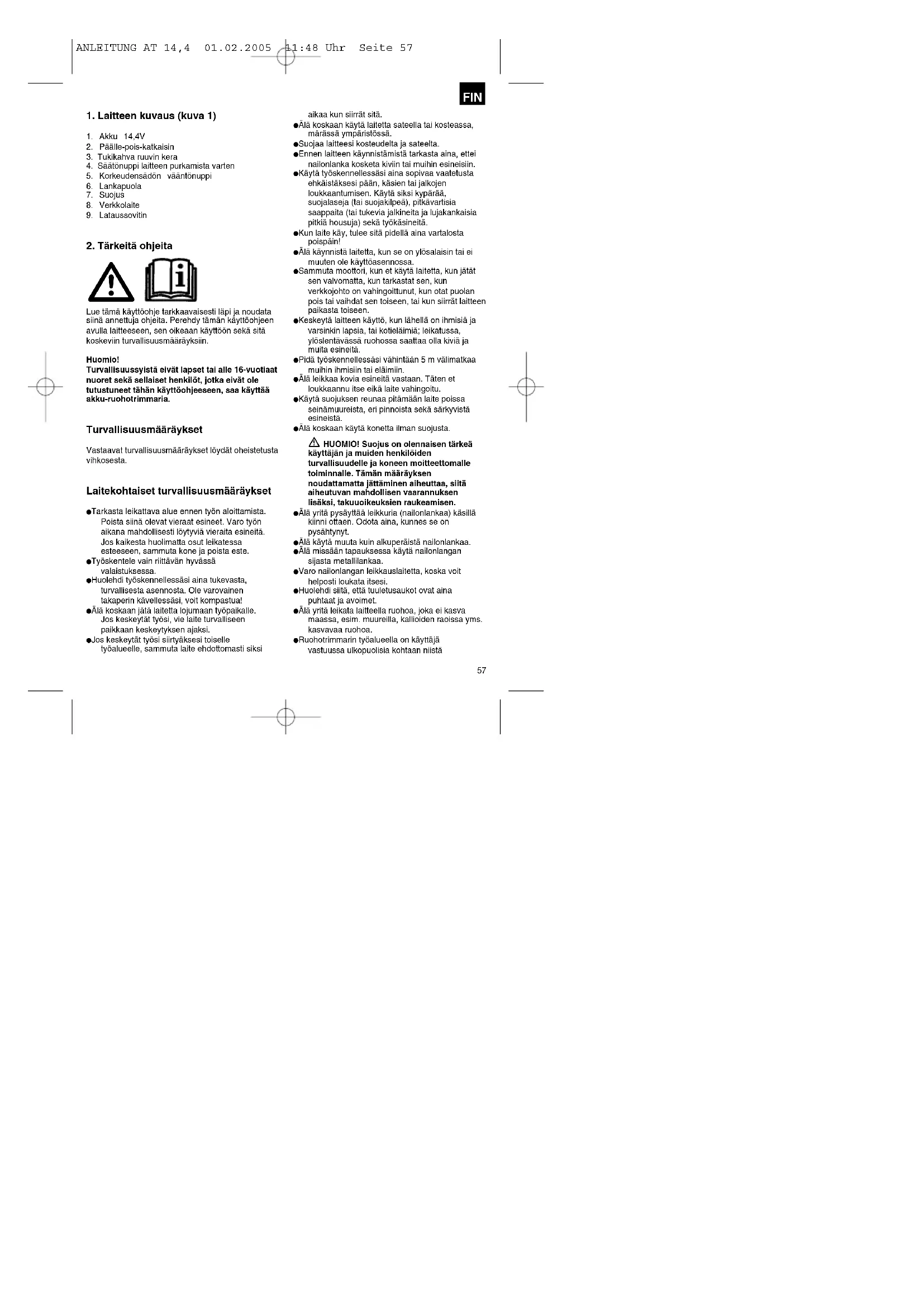 ANLEITUNG AT 14,4 01.02.2005 11:48 Uhr Seite 57vahingoista, jotka aiheutuvat laitteen käytöstä. Älä ylitä katuja tai sorateitä käyvän laitteen kanssa. Kun et käytä laitetta, säilytä se kuivassa paikassa poissa lasten ulottuvilta. Käytä laitetta ainoastaan tässä käyttöohjeessa kuvatulla tavalla ja pidä se aina pystyasennossa maata päin. Kaikki muut asennot ovat vaarallisia. Tarkasta säännöllisin väliajoin, ovatko ruuvit tiukasti kiinni. Pidä johdot ja muut esineet aina poissa leikattavalta alueelta. Jos laitetta täytyy nostaa toiseen paikkaan siirtämistä varten, tulee moottori sammuttaa ja odottaa, kunnes työkalu pysähtyy. Ennen laitteen luota poistumista tulee moottori sammuttaa ja akku irroittaa. Käytön aikana et missään tapauksessa saa leikata kovia esineitä vastaan; vain täten vältät käyttäjää uhkaavan tapaturmanvaaran ja laitteen vahingoittumisen. Käytä kunnossapitotoimiin vain alkuperäisiä varaosia. Tarkasta ennen koneen käyttöönottoa tai törmäyksen jälkeen, onko siinä merkkejä kulumisesta tai vaurioista, ja korjauta nämä tarvittaessa. Pidä kädet ja jalat aina poissa leikkauslaitteesta, varsinkin moottoria käynnistettäessä. Uuden langan ulosvedon jälkeen käännä kone aina sen tavalliseen työskentelyasentoon, ennen kuin käynnistät sen. Irroita akku ennen tarkastusta, puhdistusta tai koneeseen tehtäviä huolto- ja korjaustöitä sekä aina kun konetta ei käytetä. Huomio: Sammuttamisen jälkeenkin pyörii nailonlanka vielä muutaman sekunnin ajan!
