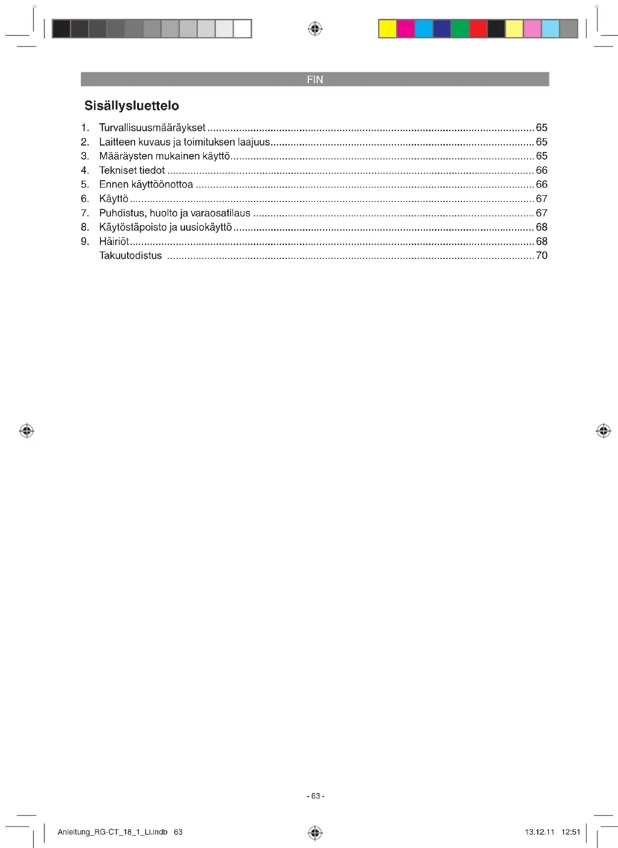 Laitteen sisällä ei ole muita huoltoa tarvitsevia osia. Anleitung_RG-CT_18_1_Li.indb 67Anleitung_RG-CT_18_1_Li.indb 67 13.12.11 12:5113.12.11 12:51FIN