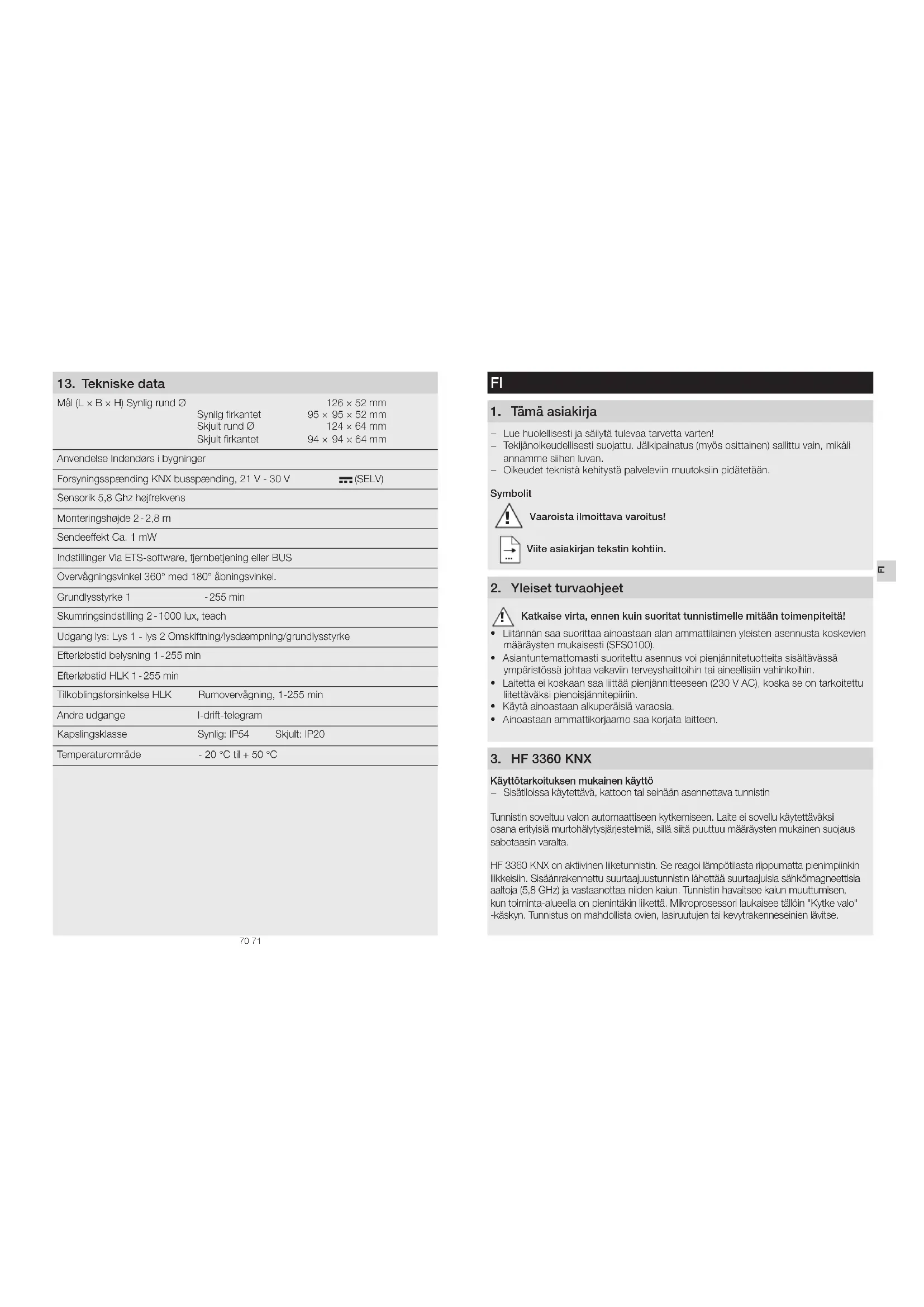 - Liitännän saa suorittaa ainoastaan alan ammattilainen yleisten asennusta koskevien määräysten mukaisesti (SFS0100).• Asiantuntemattomasti suoritettu asennus voi pienjännitetuotteita sisältävässä ympäristössä johtaa vakaviin terveyshaittoihin tai aineellisiin vahinkoihin.• Laitetta ei koskaan saa liittää pienjännitteeseen (230 V AC), koska se on tarkoitettu liitettäväksi pienoisjännitepiiriin.• Käytä ainoastaan alkuperäisiä varaosia.• Ainoastaan ammattikorjaamo saa korjata laitteen. 3 HF 3360 KNX Käyttötarkoituksen mukainen käyttö – Sisätiloissa käytettävä, kattoon tai seinään asennettava tunnistin Tunnistin soveltuu valon automaattiseen kytkemiseen. Laite ei sovellu käytettäväksi osana erityisiä murtohälytysjärjestelmiä, sillä siitä puuttuu määräysten mukainen suojaus sabotaasin varalta. HF3360KNX on aktiivinen liiketunnistin. Se reagoi lämpötilasta riippumatta pienimpiinkin liikkeisiin. Sisäänrakennettu suurtaajuustunnistin lähettää suurtaajuisia sähkömagneettisia aaltoja (5,8GHz) ja vastaanottaa niiden kaiun. Tunnistin havaitsee kaiun muuttumisen, kun toiminta-alueella on pienintäkin liikettä. Mikroprosessori laukaisee tällöin "Kytke valo" -käskyn. Tunnistus on mahdollista ovien, lasiruutujen tai kevytrakenneseinien lävitse.
