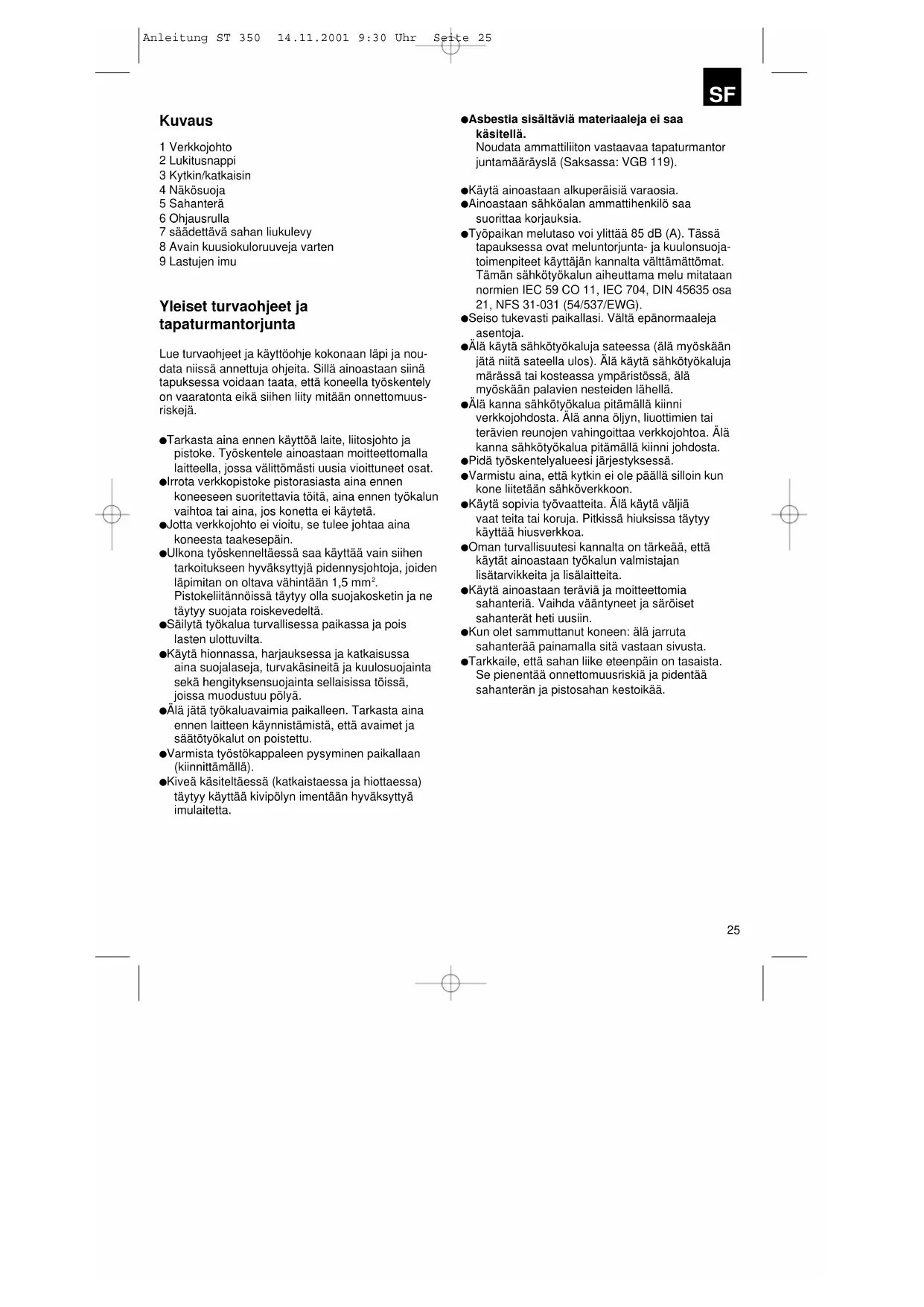 Motstycke Anleitung ST 350 14.11.2001 9:30 Uhr Seite 2425 Kuvaus 1 Verkkojohto 2 Lukitusnappi 3 Kytkin/katkaisin 4 Näkösuoja 5 Sahanterä 6 Ohjausrulla 7 säädettävä sahan liukulevy 8 Avain kuusiokuloruuveja varten 9 Lastujen imu Yleiset turvaohjeet ja tapaturmantorjunta Lue turvaohjeet ja käyttöohje kokonaan läpi ja nou- data niissä annettuja ohjeita. Sillä ainoastaan siinä tapuksessa voidaan taata, että koneella työskentely on vaaratonta eikä siihen liity mitään onnettomuus- riskejä. Tarkasta aina ennen käyttöä laite, liitosjohto ja pistoke. Työskentele ainoastaan moitteettomalla laitteella, jossa välittömästi uusia vioittuneet osat. Irrota verkkopistoke pistorasiasta aina ennen koneeseen suoritettavia töitä, aina ennen työkalun vaihtoa tai aina, jos konetta ei käytetä. Jotta verkkojohto ei vioitu, se tulee johtaa aina koneesta taakesepäin. Ulkona työskenneltäessä saa käyttää vain siihen tarkoitukseen hyväksyttyjä pidennysjohtoja, joiden läpimitan on oltava vähintään 1,5 mm