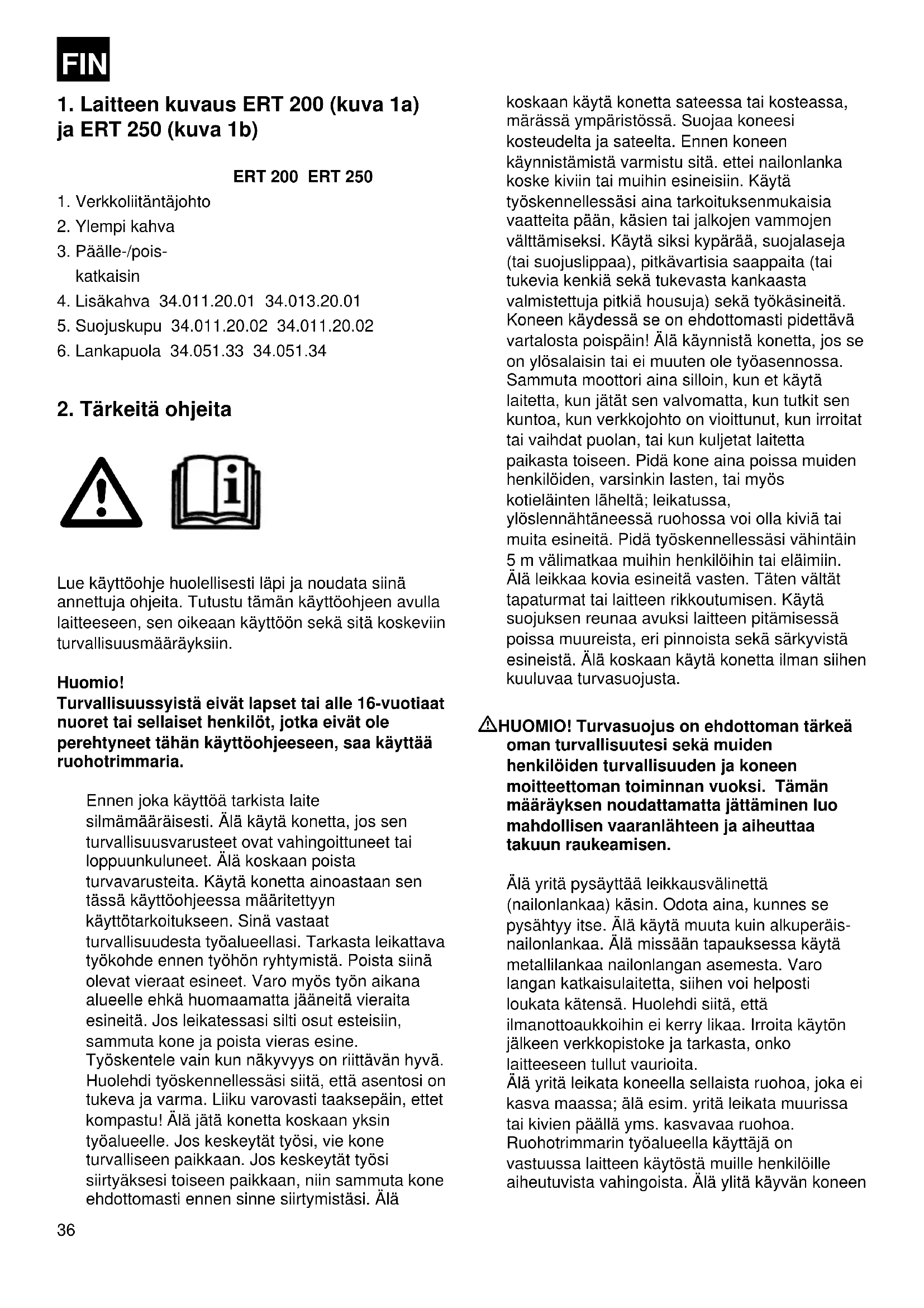 Lue käyttöohje huolellisesti läpi ja noudata siinä annettuja ohjeita. Tutustu tämän käyttöohjeen avulla laitteeseen, sen oikeaan käyttöön sekä sitä koskeviin turvallisuusmääräyksiin. Huomio! Turvallisuussyistä eivät lapset tai alle 16-vuotiaat nuoret tai sellaiset henkilöt, jotka eivät ole perehtyneet tähän käyttöohjeeseen, saa käyttää ruohotrimmaria. Ennen joka käyttöä tarkista laite silmämääräisesti. Älä käytä konetta, jos sen turvallisuusvarusteet ovat vahingoittuneet tai loppuunkuluneet. Älä koskaan poista turvavarusteita. Käytä konetta ainoastaan sen tässä käyttöohjeessa määritettyyn käyttötarkoitukseen. Sinä vastaat turvallisuudesta työalueellasi. Tarkasta leikattava työkohde ennen työhön ryhtymistä. Poista siinä olevat vieraat esineet. Varo myös työn aikana alueelle ehkä huomaamatta jääneitä vieraita esineitä. Jos leikatessasi silti osut esteisiin, sammuta kone ja poista vieras esine. Työskentele vain kun näkyvyys on riittävän hyvä. Huolehdi työskennellessäsi siitä, että asentosi on tukeva ja varma. Liiku varovasti taaksepäin, ettet kompastu! Älä jätä konetta koskaan yksin työalueelle. Jos keskeytät työsi, vie kone turvalliseen paikkaan. Jos keskeytät työsi siirtyäksesi toiseen paikkaan, niin sammuta kone ehdottomasti ennen sinne siirtymistäsi. Älä koskaan käytä konetta sateessa tai kosteassa, märässä ympäristössä. Suojaa koneesi kosteudelta ja sateelta. Ennen koneen käynnistämistä varmistu sitä. ettei nailonlanka koske kiviin tai muihin esineisiin. Käytä työskennellessäsi aina tarkoituksenmukaisia vaatteita pään, käsien tai jalkojen vammojen välttämiseksi. Käytä siksi kypärää, suojalaseja (tai suojuslippaa), pitkävartisia saappaita (tai tukevia kenkiä sekä tukevasta kankaasta valmistettuja pitkiä housuja) sekä työkäsineitä. Koneen käydessä se on ehdottomasti pidettävä vartalosta poispäin! Älä käynnistä konetta, jos se on ylösalaisin tai ei muuten ole työasennossa. Sammuta moottori aina silloin, kun et käytä laitetta, kun jätät sen valvomatta, kun tutkit sen kuntoa, kun verkkojohto on vioittunut, kun irroitat tai vaihdat puolan, tai kun kuljetat laitetta paikasta toiseen. Pidä kone aina poissa muiden henkilöiden, varsinkin lasten, tai myös kotieläinten läheltä; leikatussa, ylöslennähtäneessä ruohossa voi olla kiviä tai muita esineitä. Pidä työskennellessäsi vähintäin 5 m välimatkaa muihin henkilöihin tai eläimiin. Älä leikkaa kovia esineitä vasten. Täten vältät tapaturmat tai laitteen rikkoutumisen. Käytä suojuksen reunaa avuksi laitteen pitämisessä poissa muureista, eri pinnoista sekä särkyvistä esineistä. Älä koskaan käytä konetta ilman siihen kuuluvaa turvasuojusta. HUOMIO! Turvasuojus on ehdottoman tärkeä oman turvallisuutesi sekä muiden henkilöiden turvallisuuden ja koneen moitteettoman toiminnan vuoksi. Tämän määräyksen noudattamatta jättäminen luo mahdollisen vaaranlähteen ja aiheuttaa takuun raukeamisen. Älä yritä pysäyttää leikkausvälinettä (nailonlankaa) käsin. Odota aina, kunnes se pysähtyy itse. Älä käytä muuta kuin alkuperäis- nailonlankaa. Älä missään tapauksessa käytä metallilankaa nailonlangan asemesta. Varo langan katkaisulaitetta, siihen voi helposti loukata kätensä. Huolehdi siitä, että ilmanottoaukkoihin ei kerry likaa. Irroita käytön jälkeen verkkopistoke ja tarkasta, onko laitteeseen tullut vaurioita. Älä yritä leikata koneella sellaista ruohoa, joka ei kasva maassa; älä esim. yritä leikata muurissa tai kivien päällä yms. kasvavaa ruohoa. Ruohotrimmarin työalueella käyttäjä on vastuussa laitteen käytöstä muille henkilöille aiheutuvista vahingoista. Älä ylitä käyvän koneen FIN37 kanssa katuja tai sorateitä. Kun et käytä konetta, säilytä se kuivassa tilassa poissa lasten ulottuvilta. Käytä konetta vain tässä käyttöohjeessa annetun kuvauksen mukaisesti ja pidä se aina maahan nähden pystysuorassa asennossa. Kaikki muut asennot ovat vaarallisia. Tarkista säännöllisin väliajoin, että ruuvit ovat kireällä. Verkkojännitteen tulee vastata tyyppikilvessä annettua verkkojännitettä. Tarkasta säännöllisin väliajoin, onko verkkoliitäntäjohdossa vaurion tai vanhenemisen merkkejä. Konetta ei saa käyttää, ellei verkkoliitäntäjohto ole moitteettomassa kunnossa. Käytetyt liitäntäjohdot eivät saa olla ohuempia kuin ohuet kumiletkujohtimet tyyppi HO7RN-F standardin DIN 57282 / VDE 0282 mukaan, ja niiden vähimmäisläpimitan tulee olla 1,5 mm_. Pistokeliitäntöjen tulee olla maadoitettuja ja liitoskappaleen tulee olla suojattu roiskevedeltä. Huolehdi siitä, ettei työalueella ole johtoja tai muita esineitä. Jos laitetta täytyy nostaa sen siirtämiseksi, on moottori sammutettava ja odotettava, kunnes työkalu lakkaa pyörimästä. Ennen koneen luota poistumista on moottori sammutettava ja verkkopistoke irroitettava. Ennen laitteen liittämistä sähköverkkoon on tarkistettava, että mikään pyörivistä osista ei ole vahingoittunut ja että lankapuola on lujasti paikoillaan. Käytön aikana ei missään tapauksessa saa leikata kovia esineitä päin, vain täten vältät käyttäjälle sattuvat tapaturmat ja koneen vahingoittumisen. Käytä koneen kunnossapitoon vain alkuperäisvaraosia. Korjaukset saa suorittaa vain sähköalan ammattihenkilö. Ennen koneen käyttöönottoa ja aina törmäysten jälkeen tarkasta, onko siinä merkkejä kulumista tai vaurioitumisesta, ja huolehdi tarvittavien korjaustöiden suorittamisesta. Pidä kätesi ja jalkasi aina poissa leikkaussuunnasta, varsinkin moottoria käynnistäessäsi. Kun olet vetänyt uuden langan ulos, siirrä kone aina tavalliseen työasentoonsa ennen sen käynnistämistä. Älä koskaan käytä sellaisia varaosia tai lisävarusteita, joita koneen valmistaja ei ole suositellut tai tarkoittanut käytettäväksi. Irroita verkkopistoke aina ennen laitteen