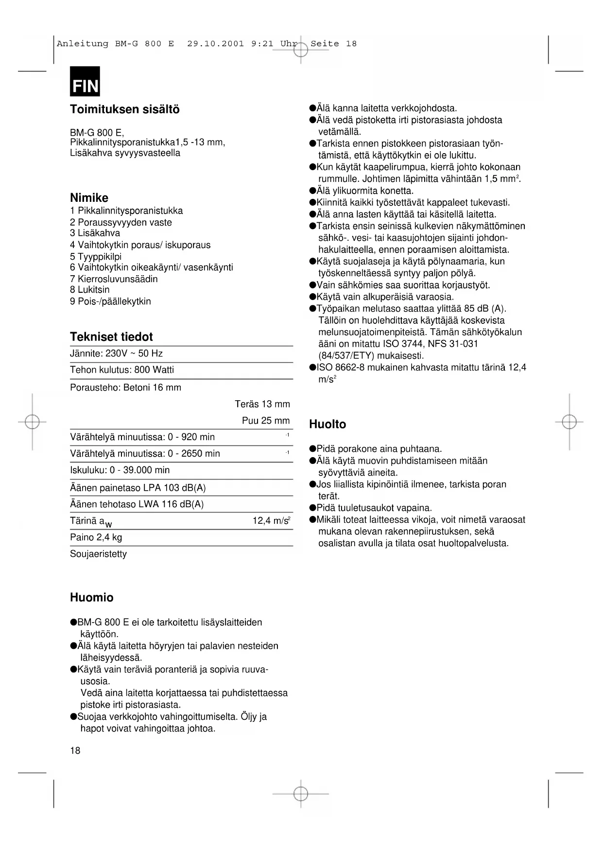 Paino 2,4 kg Soujaeristetty Huomio ● BM-G 800 E ei ole tarkoitettu lisäyslaitteiden käyttöön. ● Älä käytä laitetta höyryjen tai palavien nesteiden läheisyydessä. ● Käytä vain teräviä poranteriä ja sopivia ruuva- usosia. Vedä aina laitetta korjattaessa tai puhdistettaessa pistoke irti pistorasiasta. ● Suojaa verkkojohto vahingoittumiselta. Öljy ja hapot voivat vahingoittaa johtoa. ● Älä kanna laitetta verkkojohdosta. ● Älä vedä pistoketta irti pistorasiasta johdosta vetämällä. ● Tarkista ennen pistokkeen pistorasiaan työn- tämistä, että käyttökytkin ei ole lukittu. ● Kun käytät kaapelirumpua, kierrä johto kokonaan rummulle. Johtimen läpimitta vähintään 1,5 mm