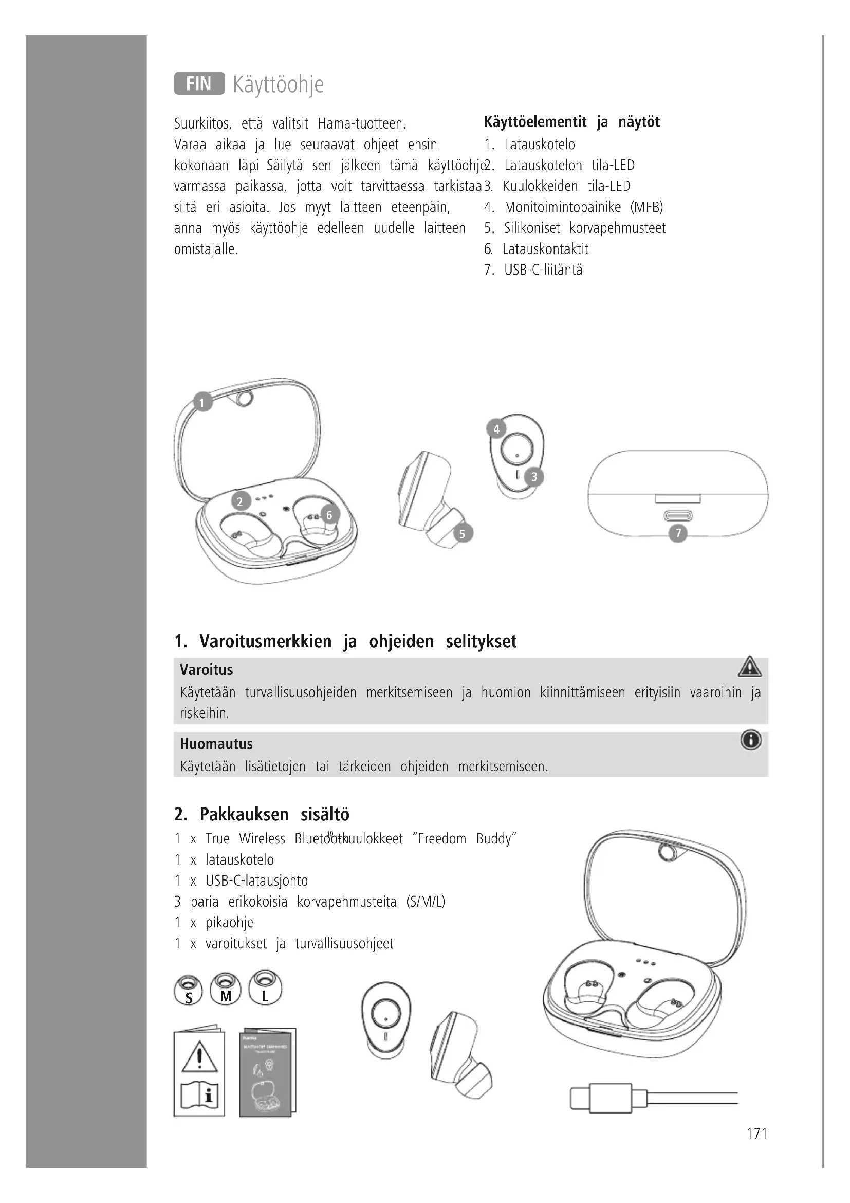 -kuulokkeet ”Freedom Buddy” 1 x latauskotelo 1 x USB-C-latausjohto 3 paria erikokoisia korvapehmusteita (S/M/L) 1 x pikaohje 1 x varoitukset ja turvallisuusohjeet