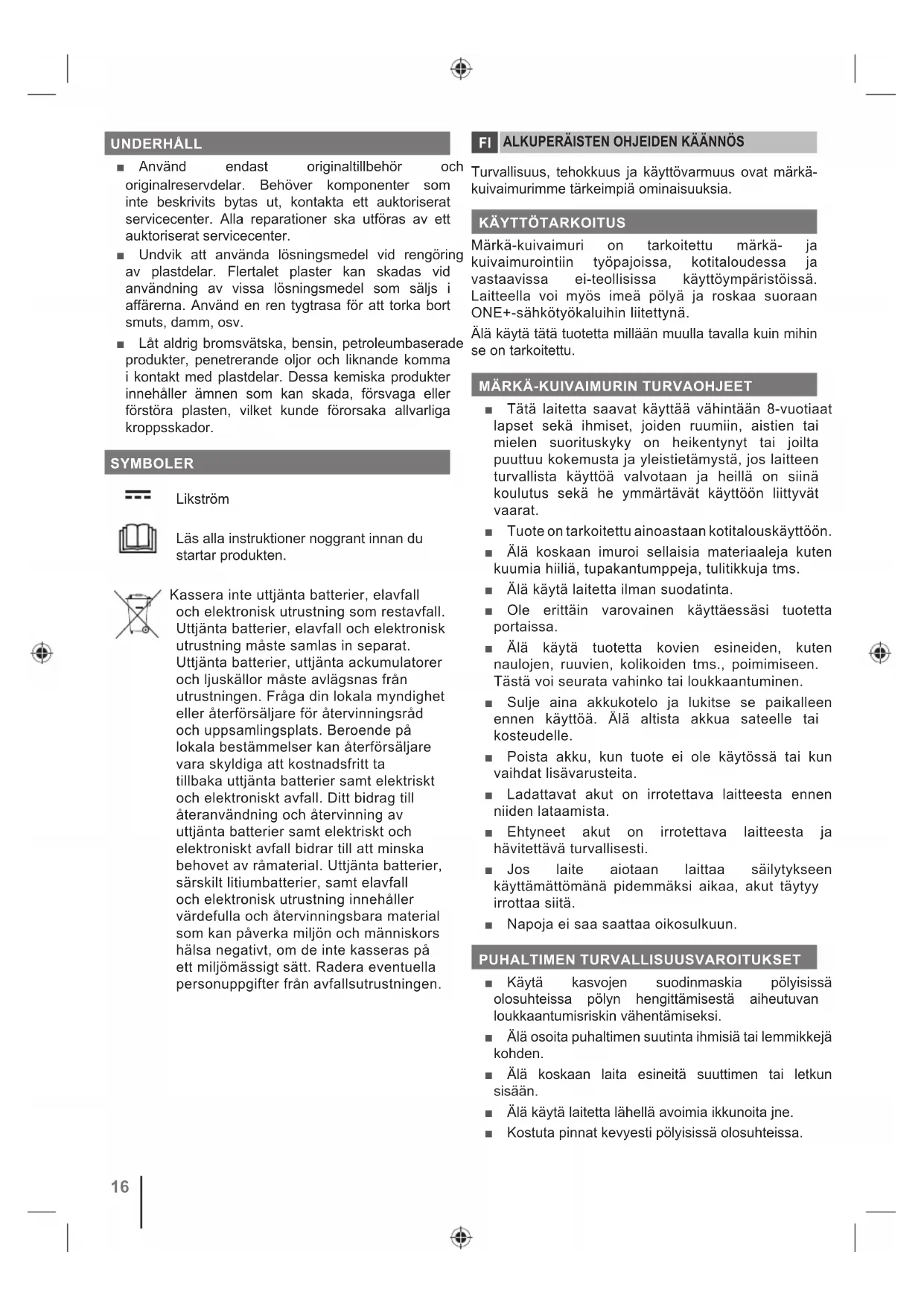 Ŷ Tätä laitetta saavat käyttää vähintään 8-vuotiaat lapset sekä ihmiset, joiden ruumiin, aistien tai mielen suorituskyky on heikentynyt tai joilta puuttuu kokemusta ja yleistietämystä, jos laitteen turvallista käyttöä valvotaan ja heillä on siinä koulutus sekä he ymmärtävät käyttöön liittyvät vaarat. Ŷ Tuote on tarkoitettu ainoastaan kotitalouskäyttöön. Ŷ Älä koskaan imuroi sellaisia materiaaleja kuten kuumia hiiliä, tupakantumppeja, tulitikkuja tms. Ŷ Älä käytä laitetta ilman suodatinta. Ŷ Ole erittäin varovainen käyttäessäsi tuotetta portaissa. Ŷ Älä käytä tuotetta kovien esineiden, kuten naulojen, ruuvien, kolikoiden tms., poimimiseen. Tästä voi seurata vahinko tai loukkaantuminen. Ŷ Sulje aina akkukotelo ja lukitse se paikalleen ennen käyttöä. Älä altista akkua sateelle tai kosteudelle. Ŷ Poista akku, kun tuote ei ole käytössä tai kun vaihdat lisävarusteita. Ŷ Ladattavat akut on irrotettava laitteesta ennen niiden lataamista. Ŷ Ehtyneet akut on irrotettava laitteesta ja hävitettävä turvallisesti. Ŷ Jos laite aiotaan laittaa säilytykseen käyttämättömänä pidemmäksi aikaa, akut täytyy irrottaa siitä. Ŷ Napoja ei saa saattaa oikosulkuun. PUHALTIMEN TURVALLISUUSVAROITUKSET Ŷ Käytä kasvojen suodinmaskia pölyisissä olosuhteissa pölyn hengittämisestä aiheutuvan loukkaantumisriskin vähentämiseksi. Ŷ Älä osoita puhaltimen suutinta ihmisiä tai lemmikkejä kohden. Ŷ Älä koskaan laita esineitä suuttimen tai letkun sisään. Ŷ Älä käytä laitetta lähellä avoimia ikkunoita jne. Ŷ Kostuta pinnat kevyesti pölyisissä olosuhteissa. 16Ŷ Älä aseta laitetta irtonaisten roskien päälle tai lähelle niitä. Roskat saattavat imeytyä ilmanottoaukkoon, mikä voi vahingoittaa tuotetta. Ŷ Älä käytä laitetta, jos sen suojus, kotelo tai kilvet ovat viallisia. Ŷ Varmista aina jalansijasi rinteissä ja kävele, älä koskaan juokse. Ŷ Älä koske liikkuviin vaarallisiin osiin ennen kuin laite on irrotettu sähköverkosta/akusta ja liikkuvat vaaralliset osat ovat täysin pysähtyneet. Ŷ Käytä tukevia jalkineita ja pitkiä housuja, kun käytät laitetta. Ŷ Jos laite putoaa, iskeytyy voimakkaasti tai alkaa täristä epänormaalisti, pysäytä laite välittömästi ja tarkista se vaurioiden varalta tai selvitä tärinän syy. Kaikki vaurioituneet osat tulee korjata asianmukaisesti tai vaihtaa valtuutetussa huoltoliikkeessä.