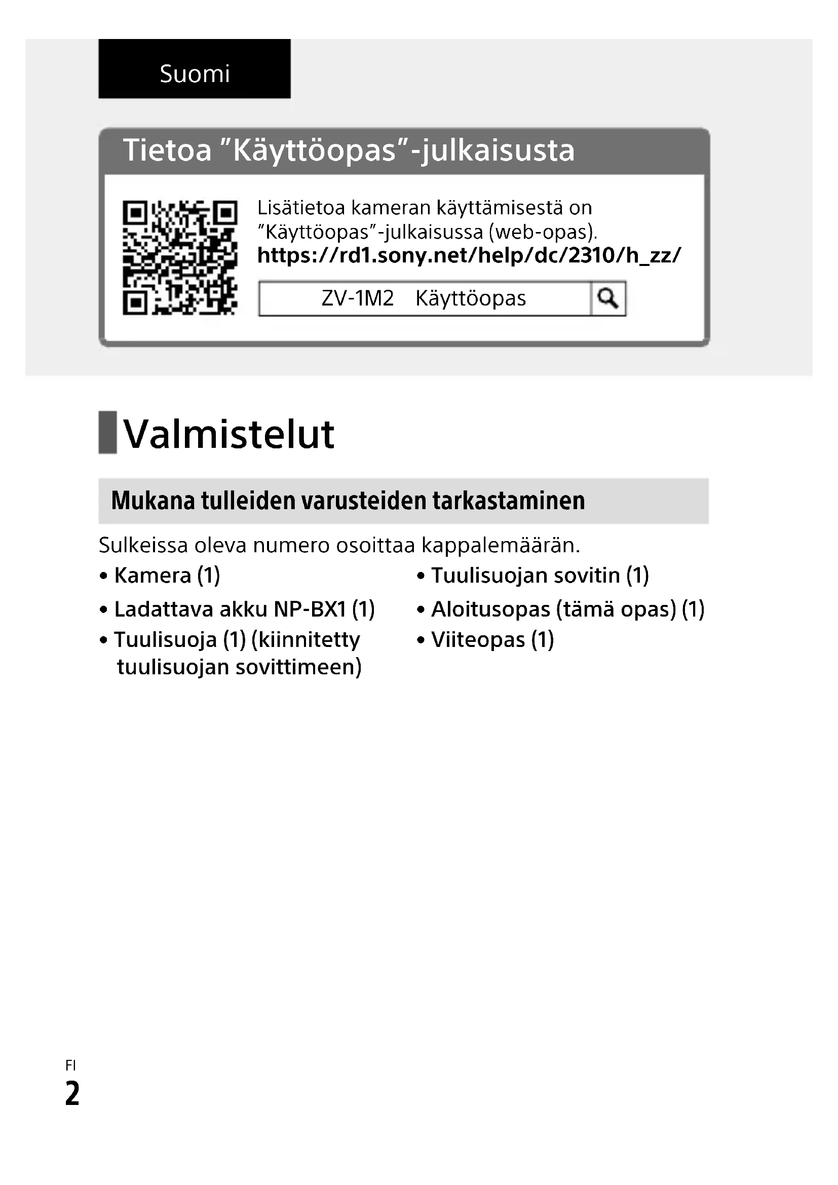 Tietoa ”Käyttöopas”-julkaisusta Lisätietoa kameran käyttämisestä on ”Käyttöopas”-julkaisussa (web-opas).https://rd1.sony.net/help/dc/2310/h_zz/ZV-1M2 Käyttöopas Suomi Valmistelut Mukana tulleiden varusteiden tarkastaminen Sulkeissa oleva numero osoittaa kappalemäärän.• Kamera (1)• Ladattava akku NP-BX1 (1)• Tuulisuoja (1) (kiinnitetty tuulisuojan sovittimeen)• Tuulisuojan sovitin (1)• Aloitusopas (tämä opas) (1)• Viiteopas (1)FI