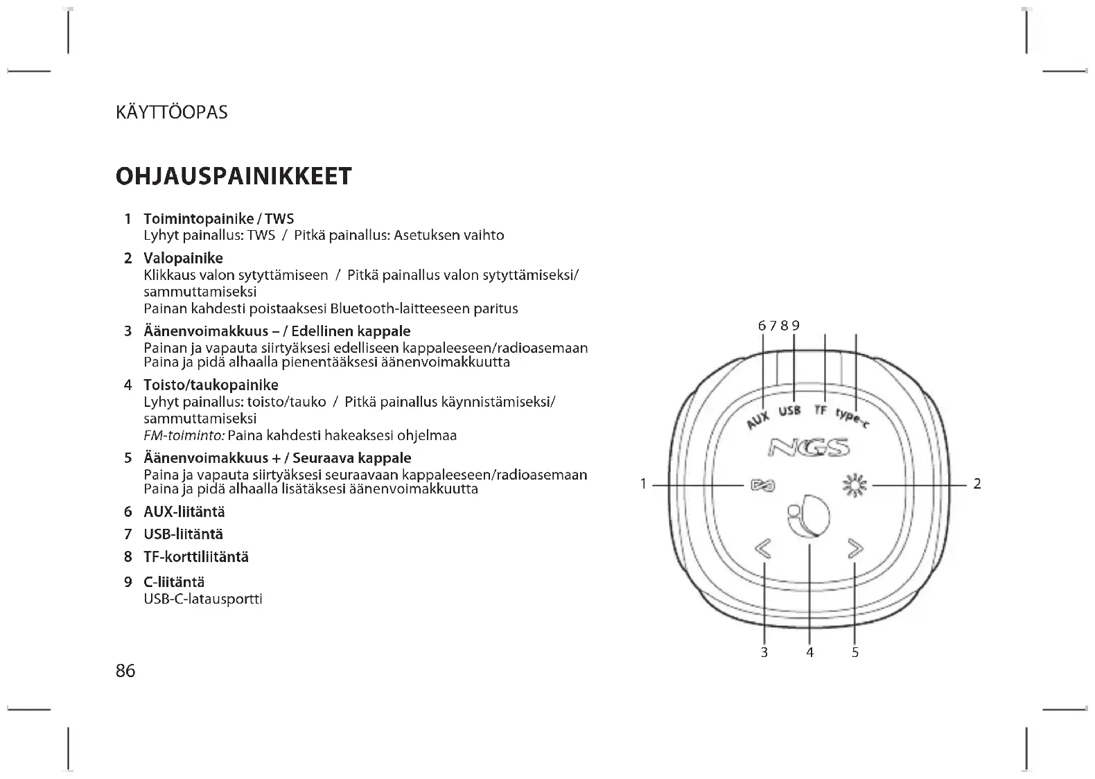 Toimintopainike / TWS Lyhyt painallus: TWS / Pitkä painallus: Asetuksen vaihto Valopainike Klikkaus valon sytyttämiseen / Pitkä painallus valon sytyttämiseksi/ sammuttamiseksi Painan kahdesti poistaaksesi Bluetooth-laitteeseen paritus Äänenvoimakkuus – / Edellinen kappale Painan ja vapauta siirtyäksesi edelliseen kappaleeseen/radioasemaan Paina ja pidä alhaalla pienentääksesi äänenvoimakkuutta Toisto/taukopainike Lyhyt painallus: toisto/tauko / Pitkä painallus käynnistämiseksi/ sammuttamiseksi FM-toiminto: Paina kahdesti hakeaksesi ohjelmaa Äänenvoimakkuus + / Seuraava kappale Paina ja vapauta siirtyäksesi seuraavaan kappaleeseen/radioasemaan Paina ja pidä alhaalla lisätäksesi äänenvoimakkuutta AUX-liitäntä USB-liitäntä TF-korttiliitäntä C-liitäntä USB-C-latausportti