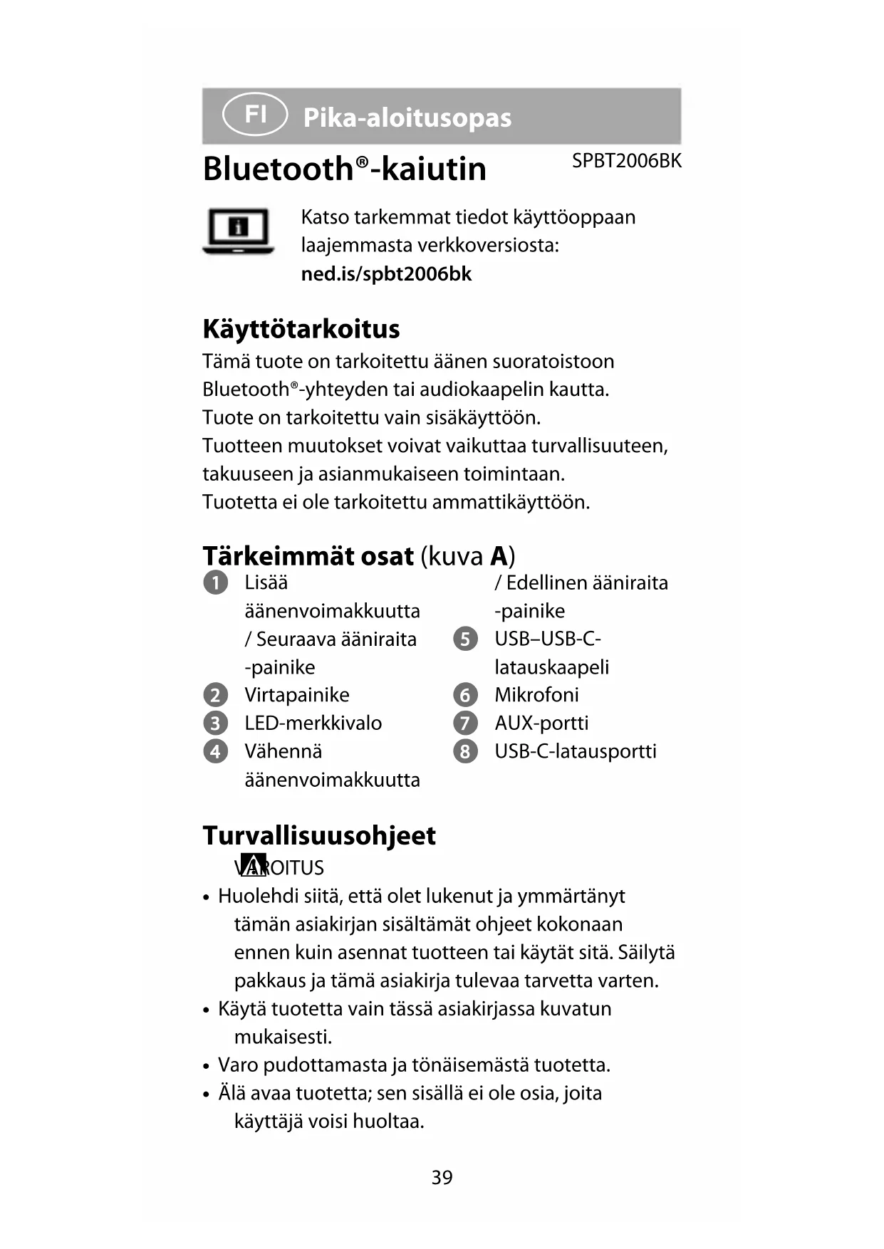Pika-aloitusopas Bluetooth®-kaiutin SPBT2006BKKatso tarkemmat tiedot käyttöoppaan laajemmasta verkkoversiosta: ned.is/spbt2006bk Käyttötarkoitus Tämä tuote on tarkoitettu äänen suoratoistoon Bluetooth®-yhteyden tai audiokaapelin kautta.Tuote on tarkoitettu vain sisäkäyttöön.Tuotteen muutokset voivat vaikuttaa turvallisuuteen, takuuseen ja asianmukaiseen toimintaan.Tuotetta ei ole tarkoitettu ammattikäyttöön. Tärkeimmät osat (kuva A) 1 Lisää äänenvoimakkuutta / Seuraava ääniraita -painike 2 Virtapainike 3 LED-merkkivalo 4 Vähennä äänenvoimakkuutta / Edellinen ääniraita -painike 5 USB–USB-C- latauskaapeli 6 Mikrofoni 7 AUX-portti 8 USB-C-latausportti Turvallisuusohjeet