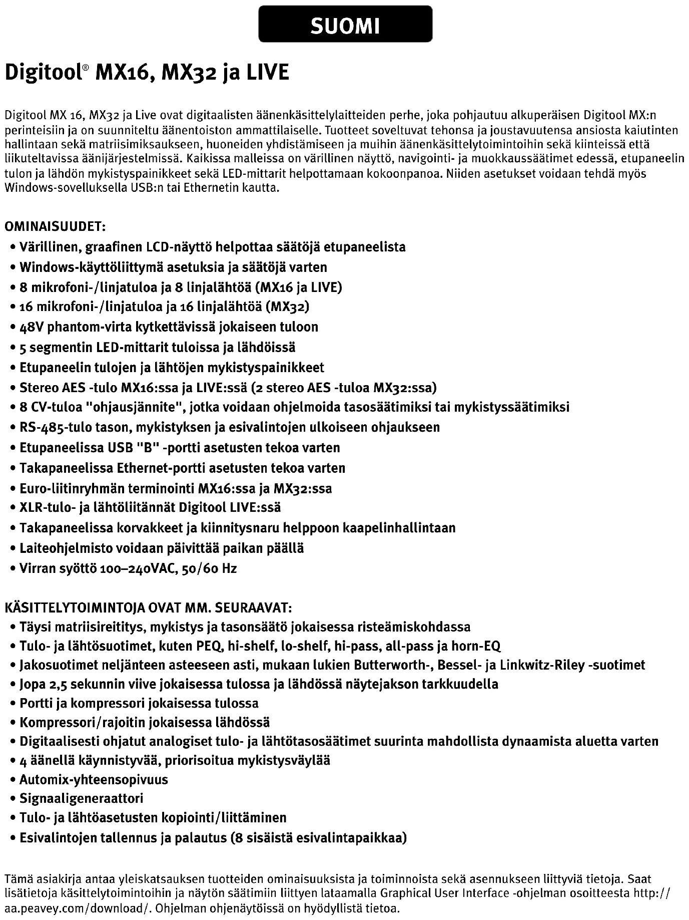 - Esivalintojen tallennus ja palautus (8 sisäistä esivalintapaikkaa) Tämä asiakirja antaa yleiskatsauksen tuotteiden ominaisuuksista ja toiminnoista sekä asennukseen liittyviä tietoja. Saat lisätietoja käsittelytoimintoihin ja näytön säätimiin liittyen lataamalla Graphical User Interface -ohjelman osoitteesta http:// aa.peavey.com/download/. Ohjelman ohjenäytöissä on hyödyllistä tietoa.Digitool