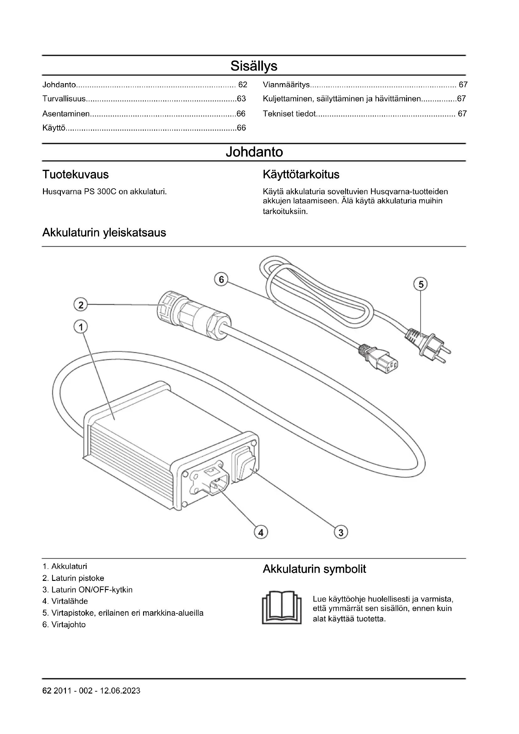 - Aku Husqvarna EV1 module Tüüp Liitiumioonaku Jõudlus 58,8 V, max 38,5 Ah 2011 - 002 - 12.06.2023 61Sisällys Johdanto p. 62