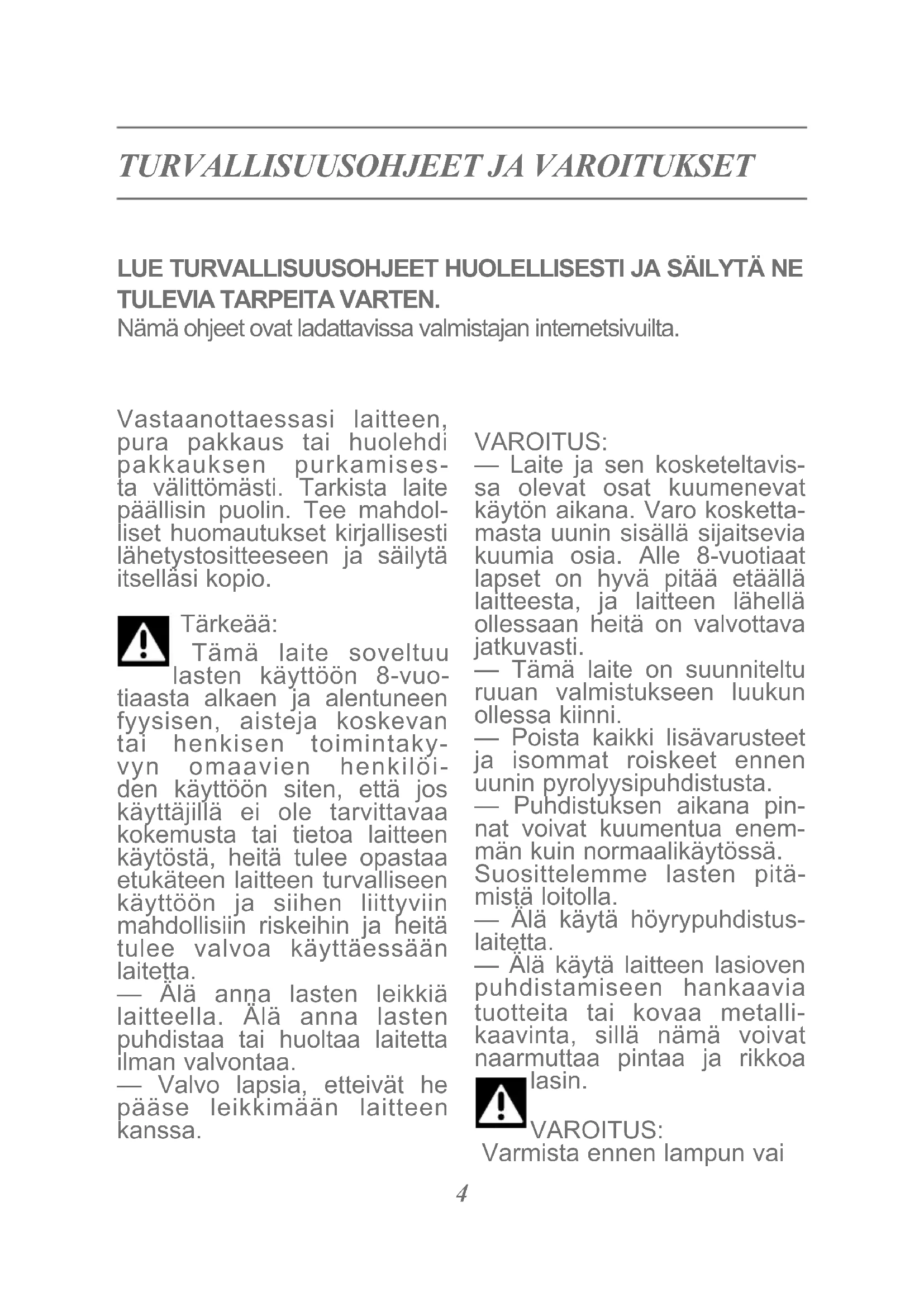 Vastaanottaessasi laitteen, pura pakkaus tai huolehdi pakkauksen purkamises- ta välittömästi. Tarkista laite päällisin puolin. Tee mahdol- liset huomautukset kirjallisesti lähetystositteeseen ja säilytä itselläsi kopio. Tärkeää: Tämä laite soveltuu lasten käyttöön 8-vuo- tiaasta alkaen ja alentuneen fyysisen, aisteja koskevan tai henkisen toimintaky- vyn omaavien henkilöi- den käyttöön siten, että jos käyttäjillä ei ole tarvittavaa kokemusta tai tietoa laitteen käytöstä, heitä tulee opastaa etukäteen laitteen turvalliseen käyttöön ja siihen liittyviin mahdollisiin riskeihin ja heitä tulee valvoa käyttäessään laitetta. — Älä anna lasten leikkiä laitteella. Älä anna lasten puhdistaa tai huoltaa laitetta ilman valvontaa. — Valvo lapsia, etteivät he pääse leikkimään laitteen kanssa. VAROITUS: — Laite ja sen kosketeltavis- sa olevat osat kuumenevat käytön aikana. Varo kosketta- masta uunin sisällä sijaitsevia kuumia osia. Alle 8-vuotiaat lapset on hyvä pitää etäällä laitteesta, ja laitteen lähellä ollessaan heitä on valvottava jatkuvasti. — Tämä laite on suunniteltu ruuan valmistukseen luukun ollessa kiinni. — Poista kaikki lisävarusteet ja isommat roiskeet ennen uunin pyrolyysipuhdistusta. — Puhdistuksen aikana pin- nat voivat kuumentua enem- män kuin normaalikäytössä. Suosittelemme lasten pitä- mistä loitolla. — Älä käytä höyrypuhdistus- laitetta. — Älä käytä laitteen lasioven puhdistamiseen hankaavia tuotteita tai kovaa metalli- kaavinta, sillä nämä voivat naarmuttaa pintaa ja rikkoa lasin. VAROITUS: Varmista ennen lampun vai LUE TURVALLISUUSOHJEET HUOLELLISESTI JA SÄILYTÄ NE TULEVIA TARPEITA VARTEN. Nämä ohjeet ovat ladattavissa valmistajan internetsivuilta.5 htamista sähköiskun ehkäi- semiseksi, että laite on irro- tettu virransyötöstä. Suorita toimenpide laitteen jäähdyttyä. Käytä kumikäsinettä lampun suojalasin irrottamiseen. Pistorasian tulee olla saavutettavissa asen- nuksen jälkeen. Laitteen erot- taminen virransyötöstä tulisi olla mahdollista joko irrotta- malla pistoke pistorasiasta tai asentamalla virtakatkaisin kiinteään putkijohtoon asennu- sohjeiden mukaisesti. — Jos virtajohto on vioittunut, sen vaihtaminen on turvalli- suussyistä annettava valmis- tajan, tämän huoltopalvelun tai jonkun muun vastaavan ammattitaidon omaavan henkilön tehtäväksi. — Tämä laite voidaan asentaa työtason alle tai kalusteisiin asennuskaavion mukaisesti. — Keskitä uuni kalusteisiin siten, että sen ja vieressä olevan kalusteen väliin jää vähintään 10 mm:n väli. Upo- tettaessa uuni kalusteisiin näi- den materiaalin tulee kestää kuumuutta (tai ne on päällys- tettävä tällaisessa materiaalil- la). Asennuksen tukevuuden parantamiseksi uuni voidaan kiinnittää kalusteisiin 2 ruuvilla sen sivutuissa olevien reikien kautta. — Laitetta ei saa asentaa koristeoven taakse ylikuume- nemisen ehkäisemiseksi. — Tämä laite on tarkoitet- tu kotikäyttöön tai sitä vas- taavaan, kuten tavaratalojen henkilöstötilojen keittiönurk- kauksiin, toimistoihin ja muille vastaaville työpaikoille; maati- loille; hotellivieraiden käyttöön, motelleihin ja muihin asuin- ja majoitustiloihin. — Uuni on sammutettava kaikkia uunin sisään kohdistu- via puhdistustoimia varten. Älä tee muutoksia laitteen ominaisuuksiin, sillä tällainen toiminta on riskialtista. Älä käytä uunia käytön jälk- een ruuan tai tavaroiden säi- lytyspaikkana.