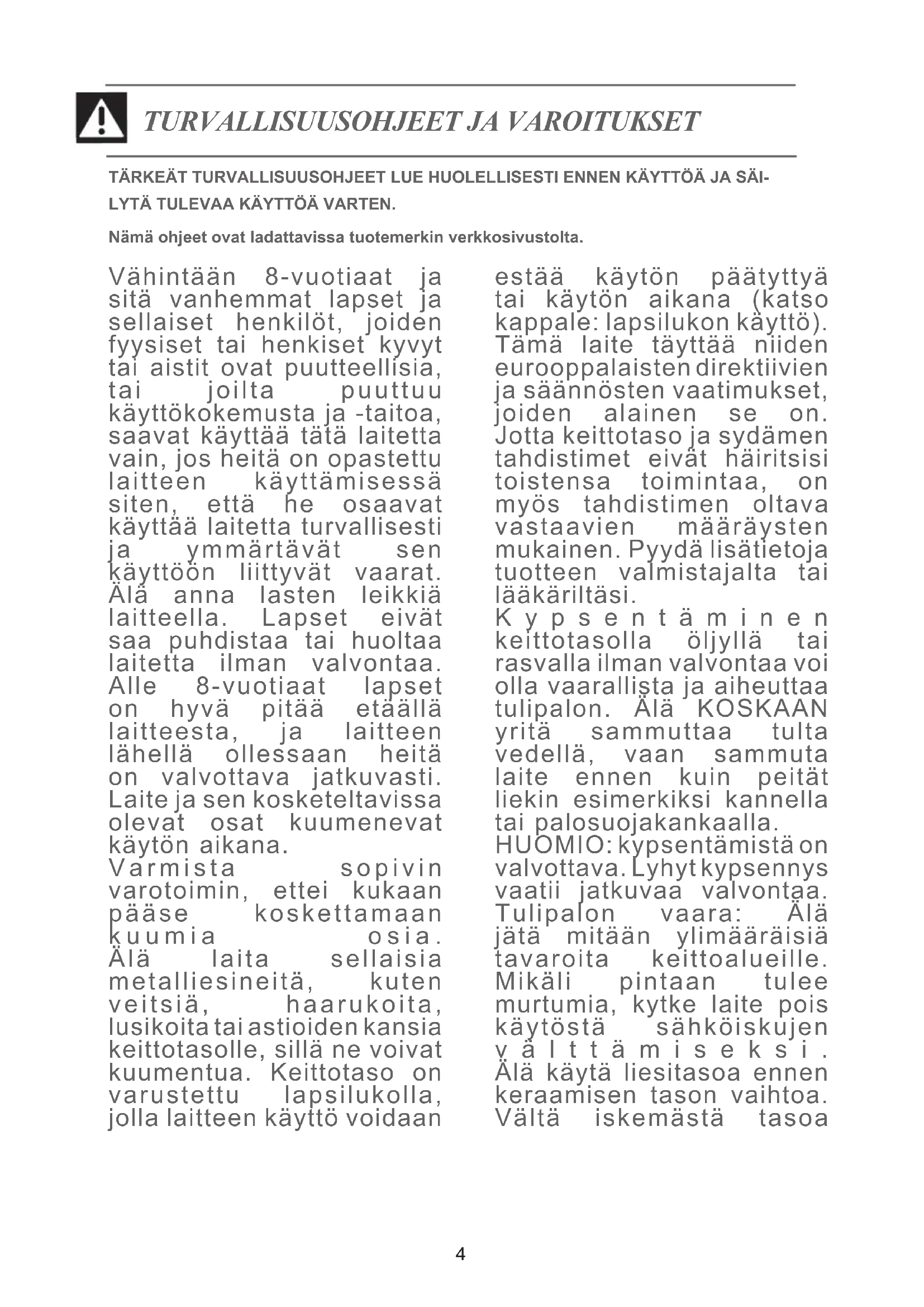 Vähintään 8-vuotiaat ja sitä vanhemmat lapset ja sellaiset henkilöt, joiden fyysiset tai henkiset kyvyt tai aistit ovat puutteellisia, tai joilta puuttuu käyttökokemusta ja -taitoa, saavat käyttää tätä laitetta vain, jos heitä on opastettu laitteen käyttämisessä siten, että he osaavat käyttää laitetta turvallisesti ja ymmärtävät sen käyttöön liittyvät vaarat. Älä anna lasten leikkiä laitteella. Lapset eivät saa puhdistaa tai huoltaa laitetta ilman valvontaa. Alle 8-vuotiaat lapset on hyvä pitää etäällä laitteesta, ja laitteen lähellä ollessaan heitä on valvottava jatkuvasti. Laite ja sen kosketeltavissa olevat osat kuumenevat käytön aikana. Varmista sopivin varotoimin, ettei kukaan pääse koskettamaan kuumia osia. Älä laita sellaisia metalliesineitä, kuten veitsiä, haarukoita, lusikoita tai astioiden kansia keittotasolle, sillä ne voivat kuumentua. Keittotaso on varustettu lapsilukolla, jolla laitteen käyttö voidaan estää käytön päätyttyä tai käytön aikana (katso kappale: lapsilukon käyttö). Tämä laite täyttää niiden eurooppalaisten direktiivien ja säännösten vaatimukset, joiden alainen se on. Jotta keittotaso ja sydämen tahdistimet eivät häiritsisi toistensa toimintaa, on myös tahdistimen oltava vastaavien määräysten mukainen. Pyydä lisätietoja tuotteen valmistajalta tai lääkäriltäsi. Kypsentäminen keittotasolla öljyllä tai rasvalla ilman valvontaa voi olla vaarallista ja aiheuttaa tulipalon. Älä KOSKAAN yritä sammuttaa tulta vedellä, vaan sammuta laite ennen kuin peität liekin esimerkiksi kannella tai palosuojakankaalla. HUOMIO: kypsentämistä on valvottava. Lyhyt kypsennys vaatii jatkuvaa valvontaa. Tulipalon vaara: Älä jätä mitään ylimääräisiä tavaroita keittoalueille. Mikäli pintaan tulee murtumia, kytke laite pois käytöstä sähköiskujen välttämiseksi. Älä käytä liesitasoa ennen keraamisen tason vaihtoa. Vältä iskemästä tasoa5