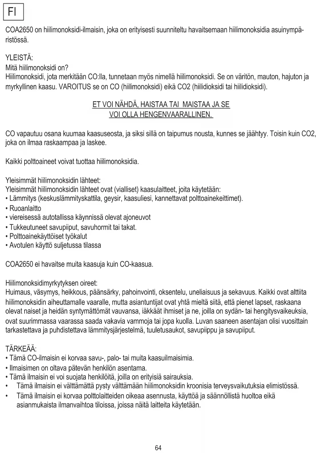 - Tämä ilmaisin ei korvaa polttolaitteiden oikeaa asennusta, käyttöä ja säännöllistä huoltoa eikä asianmukaista ilmanvaihtoa tiloissa, joissa näitä laitteita käytetään.65