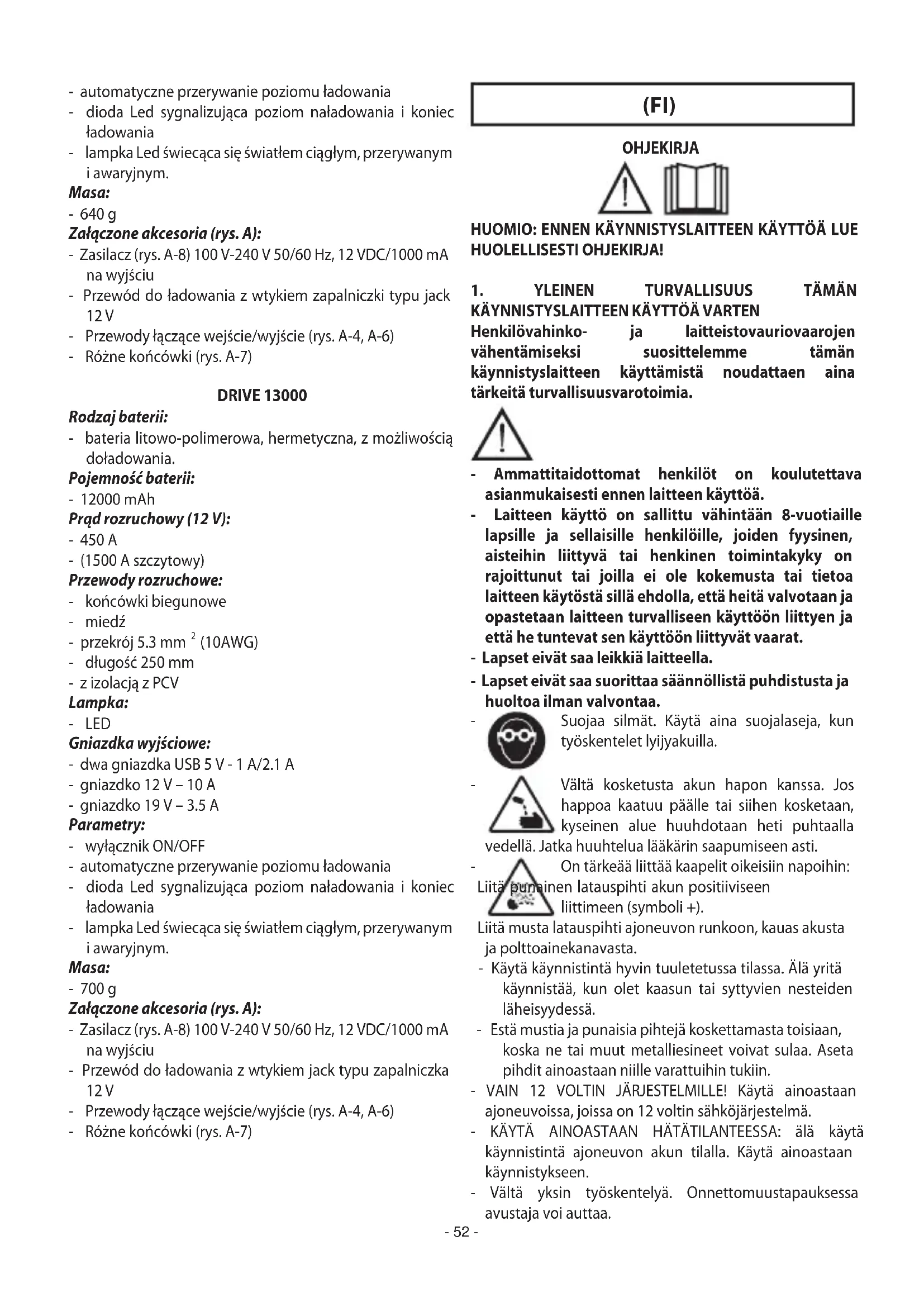 Latauskaapeli savukkeensytyttimen jakkipistokkeella 12 V - Tulo-/lähtoliitoskaapelit (kuva A-4, A-6) - Eri päätteet (kuva A-7) DRIVE 13000 Akkutyyppi: - hermeettinen, ladattava litiumpolymeeriakku. Akun kapasiteetti: - 12000 mAh Käynnistysvirta (12 V): - 450 A - (huippuvirta 1500 A) Käynnistyskaapelit: - polarisoidut päätteet - kupari - leikkaus 5.3 mm