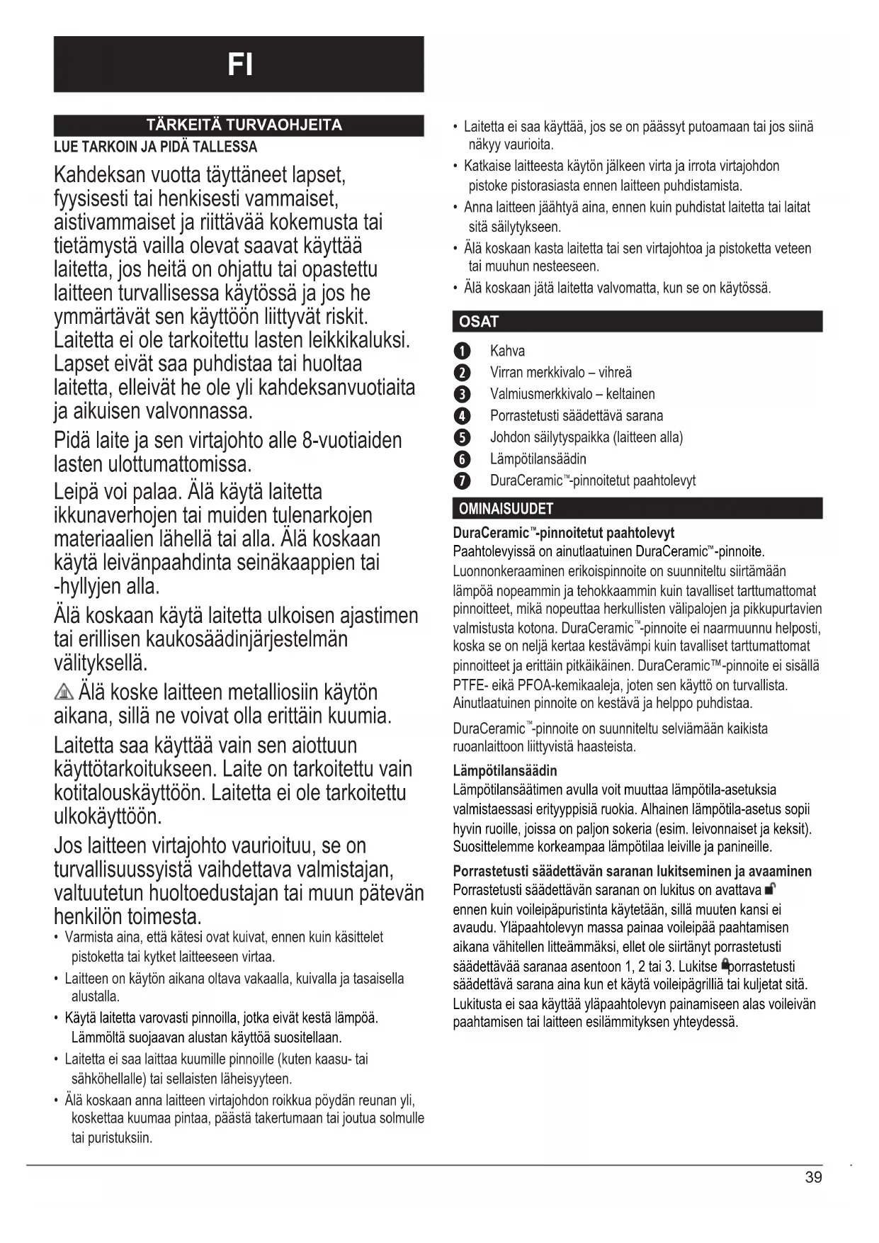 Kahdeksan vuotta täyttäneet lapset, fyysisesti tai henkisesti vammaiset, aistivammaiset ja riittävää kokemusta tai tietämystä vailla olevat saavat käyttää laitetta, jos heitä on ohjattu tai opastettu laitteen turvallisessa käytössä ja jos he ymmärtävät sen käyttöön liittyvät riskit. Laitetta ei ole tarkoitettu lasten leikkikaluksi. Lapset eivät saa puhdistaa tai huoltaa laitetta, elleivät he ole yli kahdeksanvuotiaita ja aikuisen valvonnassa. Pidä laite ja sen virtajohto alle 8-vuotiaiden lasten ulottumattomissa. Leipä voi palaa. Älä käytä laitetta ikkunaverhojen tai muiden tulenarkojen materiaalien lähellä tai alla. Älä koskaan käytä leivänpaahdinta seinäkaappien tai -hyllyjen alla. Älä koskaan käytä laitetta ulkoisen ajastimen tai erillisen kaukosäädinjärjestelmän välityksellä. Älä koske laitteen metalliosiin käytön aikana, sillä ne voivat olla erittäin kuumia. Laitetta saa käyttää vain sen aiottuun käyttötarkoitukseen. Laite on tarkoitettu vain kotitalouskäyttöön. Laitetta ei ole tarkoitettu ulkokäyttöön. Jos laitteen virtajohto vaurioituu, se on turvallisuussyistä vaihdettava valmistajan, valtuutetun huoltoedustajan tai muun pätevän henkilön toimesta.