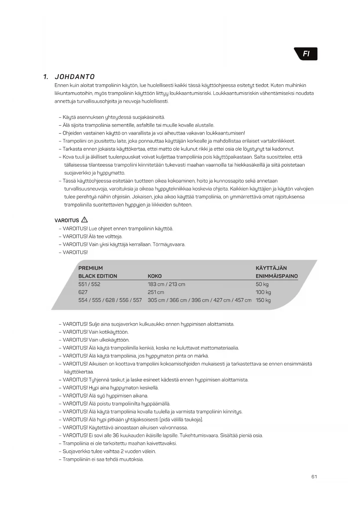 – VAROITUS! Sulje aina suojaverkon kulkuaukko ennen hyppimisen aloittamista. – VAROITUS! Vain kotikäyttöön. – VAROITUS! Vain ulkokäyttöön. – VAROITUS! Älä käytä trampoliinilla kenkiä, koska ne kuluttavat mattomateriaalia. – VAROITUS! Älä käytä trampoliinia, jos hyppymaton pinta on märkä. – VAROITUS! Aikuisen on koottava trampoliini kokoamisohjeiden mukaisesti ja tarkastettava se ennen ensimmäistä käyttökertaa. – VAROITUS! Tyhjennä taskut ja laske esineet kädestä ennen hyppimisen aloittamista. – VAROITUS! Hypi aina hyppymaton keskellä. – VAROITUS! Älä syö hyppimisen aikana. – VAROITUS! Älä poistu trampoliinilta hyppäämällä. – VAROITUS! Älä käytä trampoliinia kovalla tuulella ja varmista trampoliinin kiinnitys. – VAROITUS! Älä hypi pitkään yhtäjaksoisesti (pidä välillä taukoja). – VAROITUS! Käytettävä ainoastaan aikuisen valvonnassa. – VAROITUS! Ei sovi alle 36 kuukauden ikäisille lapsille. Tukehtumisvaara. Sisältää pieniä osia. – Trampoliinia ei ole tarkoitettu maahan kaivettavaksi. – Suojaverkko tulee vaihtaa 2 vuoden välein. – Trampoliiniin ei saa tehdä muutoksia. PREMIUM BLACK EDITION 551 / 552