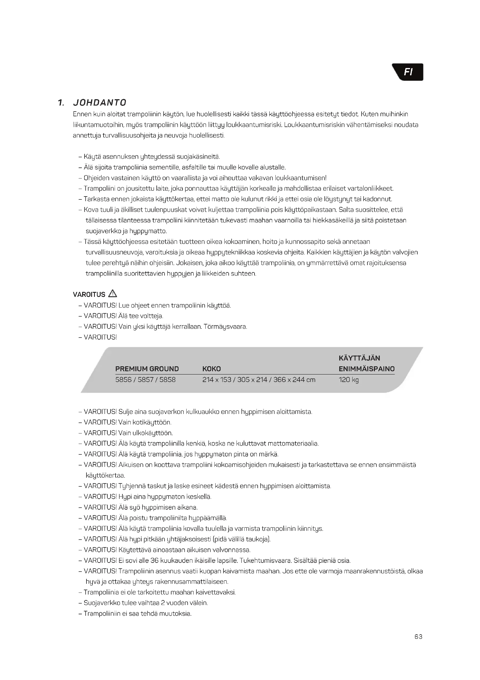 – VAROITUS! Sulje aina suojaverkon kulkuaukko ennen hyppimisen aloittamista. – VAROITUS! Vain kotikäyttöön. – VAROITUS! Vain ulkokäyttöön. – VAROITUS! Älä käytä trampoliinilla kenkiä, koska ne kuluttavat mattomateriaalia. – VAROITUS! Älä käytä trampoliinia, jos hyppymaton pinta on märkä. – VAROITUS! Aikuisen on koottava trampoliini kokoamisohjeiden mukaisesti ja tarkastettava se ennen ensimmäistä käyttökertaa. – VAROITUS! Tyhjennä taskut ja laske esineet kädestä ennen hyppimisen aloittamista. – VAROITUS! Hypi aina hyppymaton keskellä. – VAROITUS! Älä syö hyppimisen aikana. – VAROITUS! Älä poistu trampoliinilta hyppäämällä. – VAROITUS! Älä käytä trampoliinia kovalla tuulella ja varmista trampoliinin kiinnitys. – VAROITUS! Älä hypi pitkään yhtäjaksoisesti (pidä välillä taukoja). – VAROITUS! Käytettävä ainoastaan aikuisen valvonnassa. – VAROITUS! Ei sovi alle 36 kuukauden ikäisille lapsille. Tukehtumisvaara. Sisältää pieniä osia. – VAROITUS! Trampoliinin asennus vaatii kuopan kaivamista maahan. Jos ette ole varmoja maanrakennustöistä, olkaa hyvä ja ottakaa yhteys rakennusammattilaiseen. – Trampoliinia ei ole tarkoitettu maahan kaivettavaksi. – Suojaverkko tulee vaihtaa 2 vuoden välein. – Trampoliiniin ei saa tehdä muutoksia.