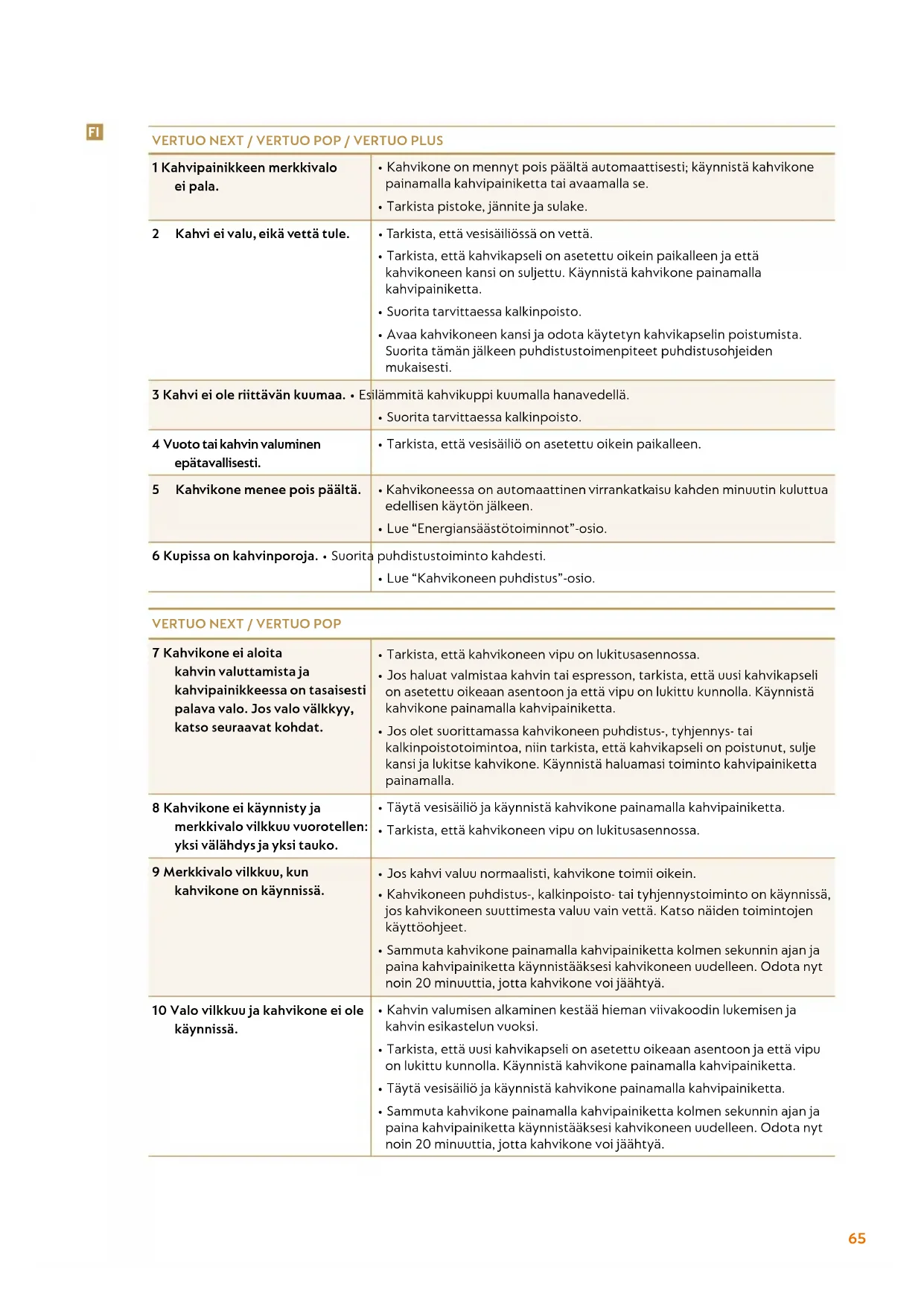 - Kalkinpoisto on tarpeen: kahvia voidaan valmistaa tämän merkkivaloilmoituksen jälkeen vain muutaman kerran ennen kuin kalkinpoisto on pakollista suoriaa. VERTUO PLUS 7b Kahvikoneessa on kahvivuoto. • Avaa kahvikoneen kansi ja odota käytetyn kahvikapselin poistumista. Suorita tämän jälkeen puhdistustoiminto.