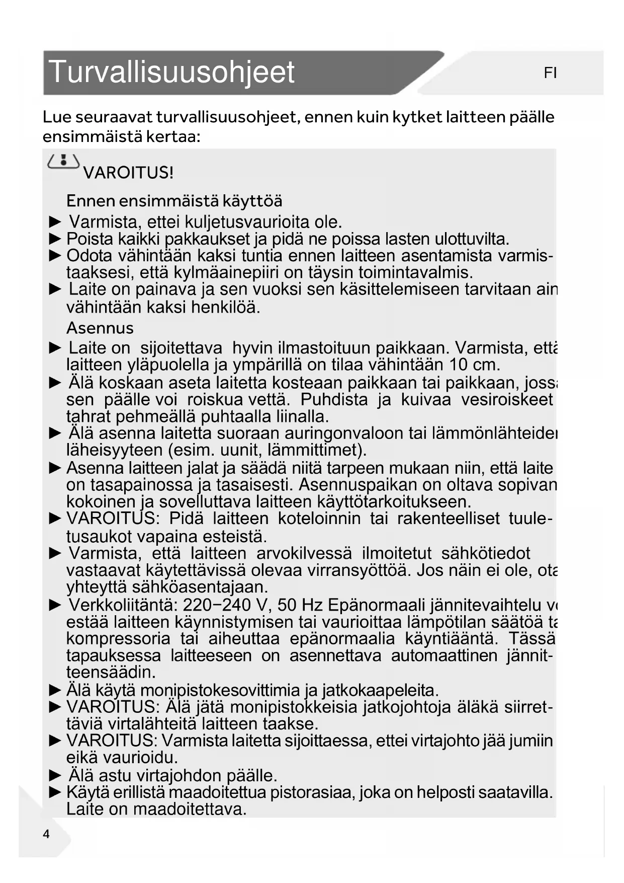 VAROITUS! Ennen ensimmäistä käyttöä ► Varmista, ettei kuljetusvaurioita ole. ► Poista kaikki pakkaukset ja pidä ne poissa lasten ulottuvilta. ► Odota vähintään kaksi tuntia ennen laitteen asentamista varmis- taaksesi, että kylmäainepiiri on täysin toimintavalmis. ► Laite on painava ja sen vuoksi sen käsittelemiseen tarvitaan aina vähintään kaksi henkilöä. Asennus ► Laite on sijoitettava hyvin ilmastoituun paikkaan. Varmista, että laitteen yläpuolella ja ympärillä on tilaa vähintään 10 cm. ► Älä koskaan aseta laitetta kosteaan paikkaan tai paikkaan, jossa sen päälle voi roiskua vettä. Puhdista ja kuivaa vesiroiskeet ja tahrat pehmeällä puhtaalla liinalla. ► Älä asenna laitetta suoraan auringonvaloon tai lämmönlähteiden läheisyyteen (esim. uunit, lämmittimet). ► Asenna laitteen jalat ja säädä niitä tarpeen mukaan niin, että laite on tasapainossa ja tasaisesti. Asennuspaikan on oltava sopivan kokoinen ja sovelluttava laitteen käyttötarkoitukseen. ► VAROITUS: Pidä laitteen koteloinnin tai rakenteelliset tuule- tusaukot vapaina esteistä. ► Varmista, että laitteen arvokilvessä ilmoitetut sähkötiedot vastaavat käytettävissä olevaa virransyöttöä. Jos näin ei ole, ota yhteyttä sähköasentajaan. ► Verkkoliitäntä: 220−240 V, 50 Hz Epänormaali jännitevaihtelu voi estää laitteen käynnistymisen tai vaurioittaa lämpötilan säätöä tai kompressoria tai aiheuttaa epänormaalia käyntiääntä. Tässä tapauksessa laitteeseen on asennettava automaattinen jännit- teensäädin. ► Älä käytä monipistokesovittimia ja jatkokaapeleita. ► VAROITUS: Älä jätä monipistokkeisia jatkojohtoja äläkä siirret- täviä virtalähteitä laitteen taakse. ► VAROITUS: Varmista laitetta sijoittaessa, ettei virtajohto jää jumiin eikä vaurioidu. ► Älä astu virtajohdon päälle. ► Käytä erillistä maadoitettua pistorasiaa, joka on helposti saatavilla. Laite on maadoitettava.FI Turvallisuusohjeet