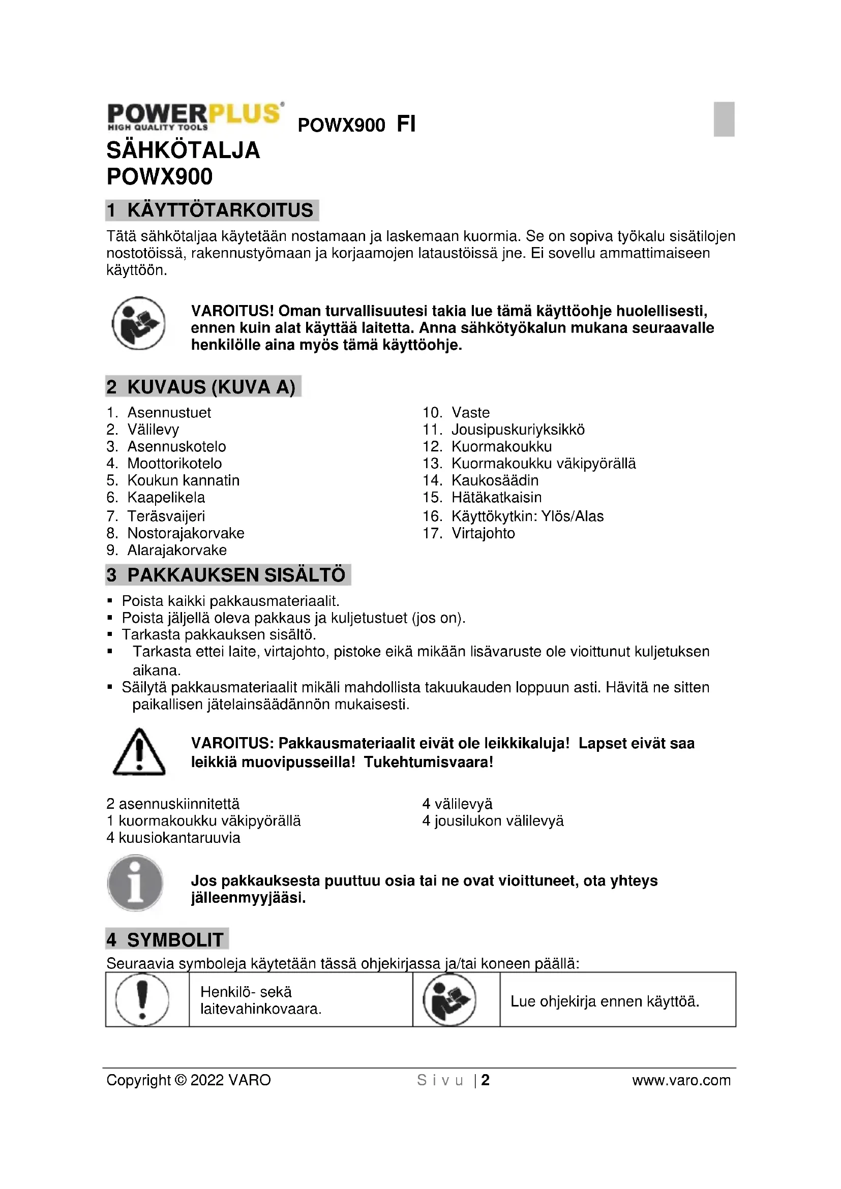 Lue ohjekirja ennen käyttöä.POWX900 FI Copyright © 2022 VARO S i v u | 3 www.varo.com